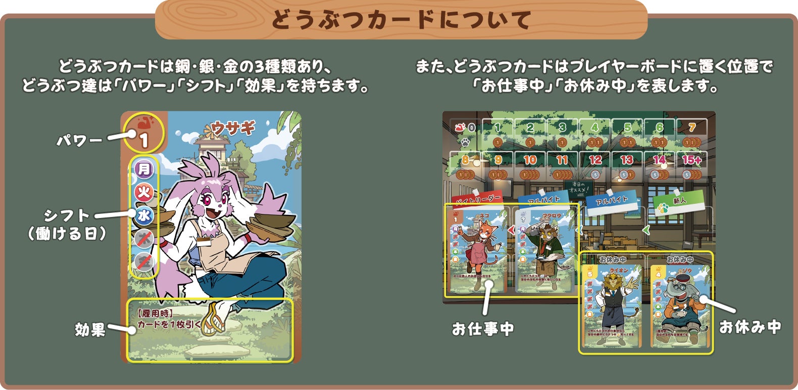 「曜日カード」の「曜日」と「シフト」が一致しているどうぶつにのみ働いてもらうことができ、「効果」はシフトに関わらず発動されます。