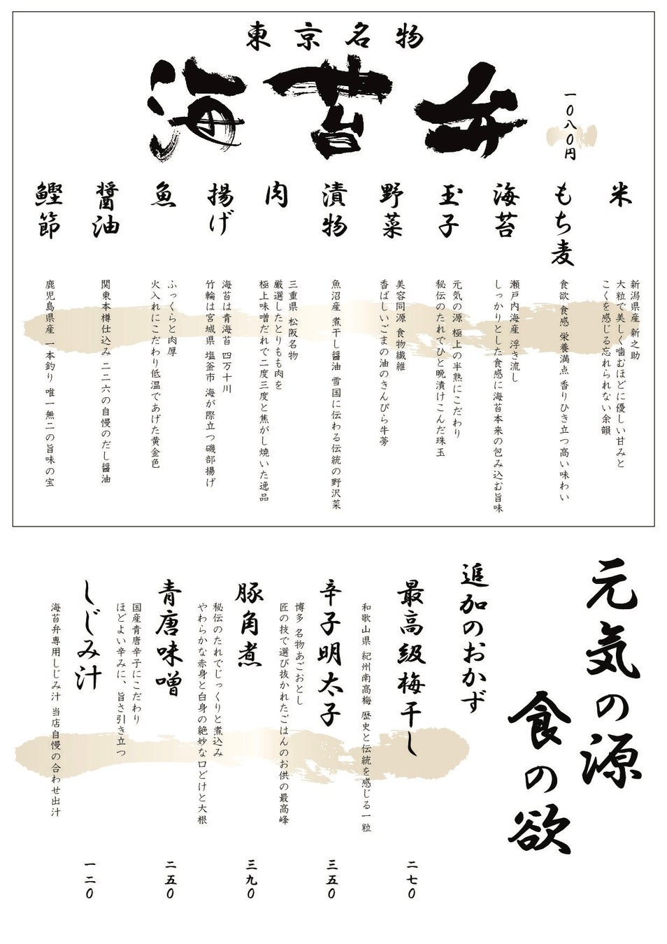 もちろんメニューは名物 海苔弁に加え季節の海苔弁、創業以来継ぎ足しの秘伝の豚角煮、この季節に嬉しい炊き立てのしじみ汁など靖国本店と変わらぬメニュー構成。