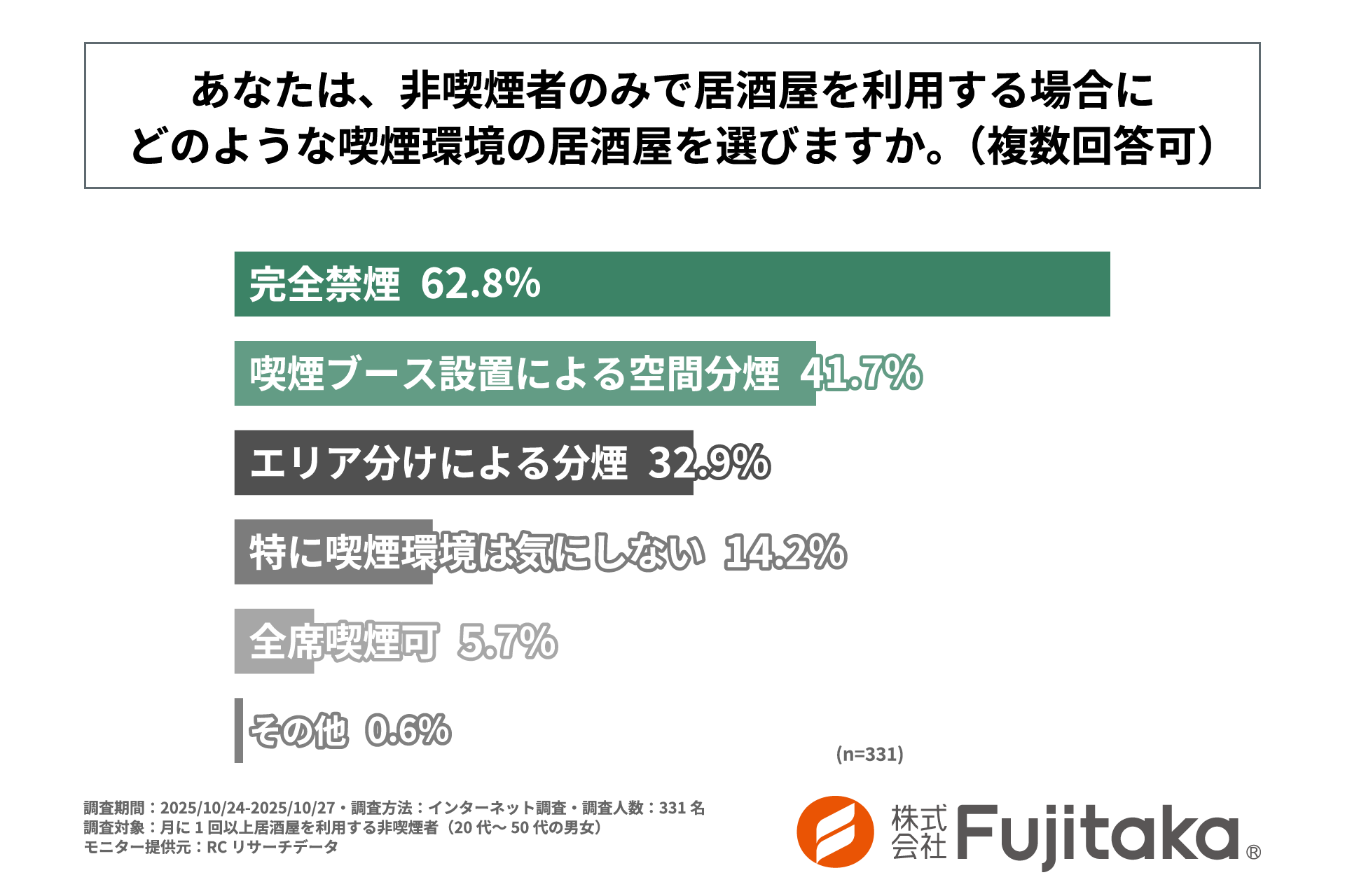 株式会社Fujitaka(本社:京都府京都市、代表取締役:髙井 茂行)は、月に1回以上居酒屋を利用する非喫煙者(20代~50代の男女)を対象に「居酒屋の喫煙環境に関する非喫煙者の意識と実態調査」を実施しました。この調査から、月に1回以上居酒屋を利用する非喫煙者における、居酒屋の喫煙環境が店選びに与える影響や、同行者の喫煙習慣の有無によって選ぶ店の喫煙環境などが明らかになりました。