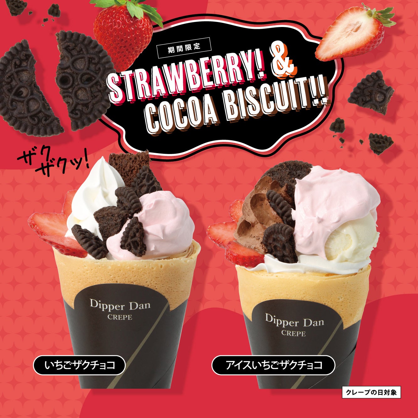春にピッタリのイチゴの甘酸っぱい風味とココア風味のビスケットの組み合わせは食べ進めることで食感の変化もお楽しみいただけるクレープ。