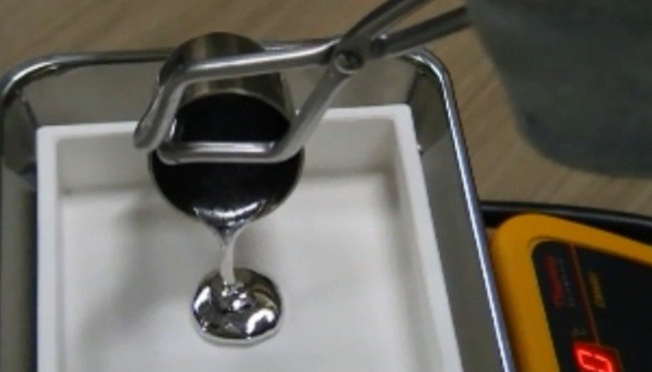 (4) 液体リチウム鉛燃料増殖材:鉛とリチウムの液体合金で、中性子を増倍する機能と三重水素を増殖する機能を併せ持つもの。液体金属(写真)は、金属でありながら流体であるため、優れた冷却性能を備えている。