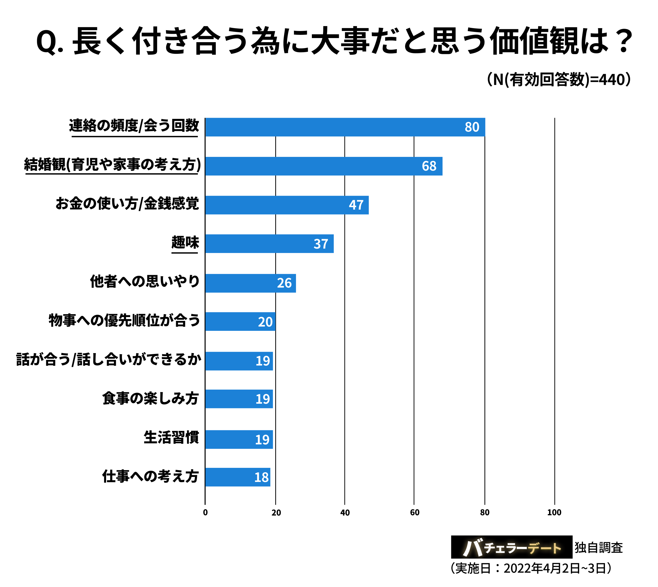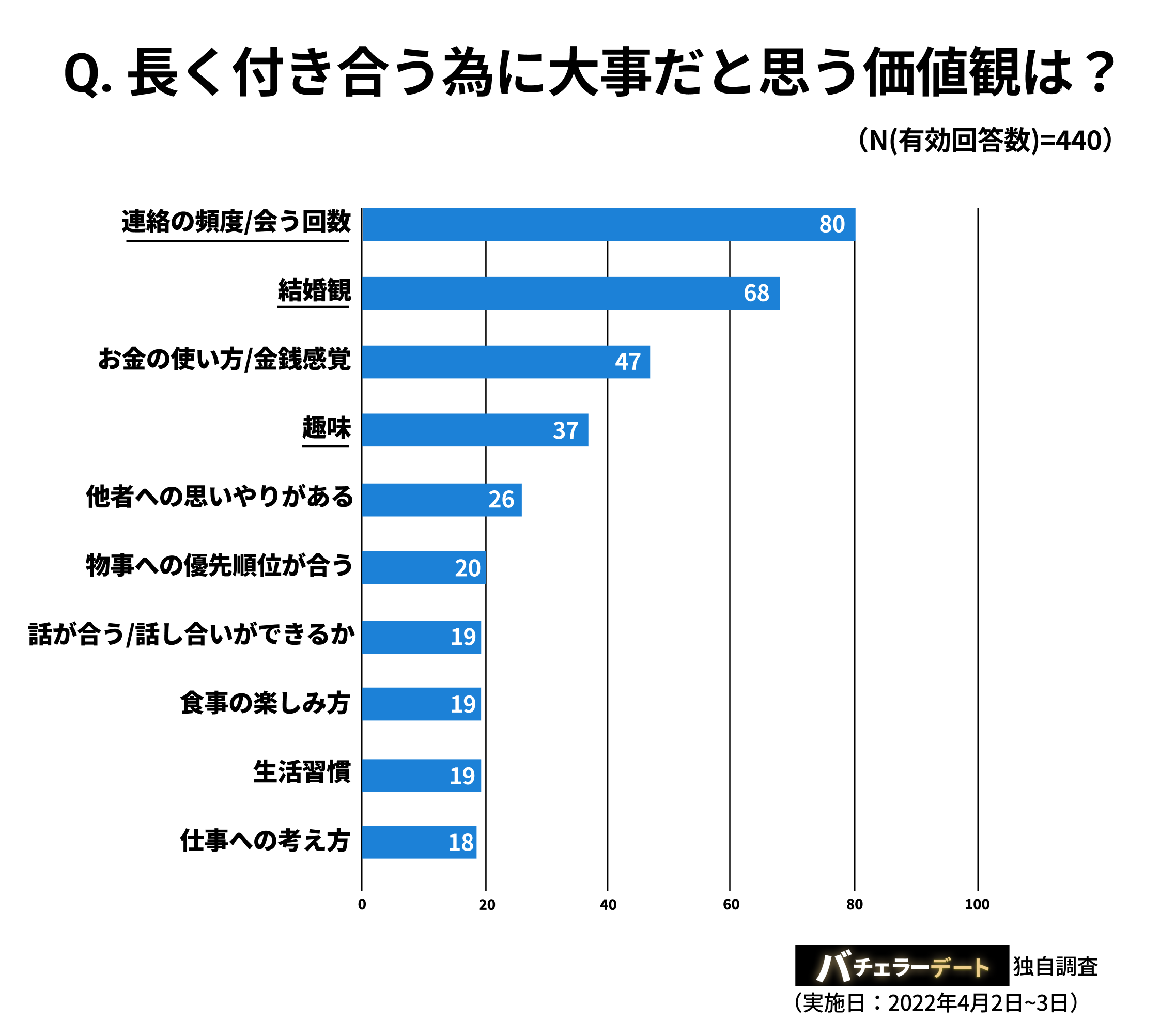 ■持続可能な関係を築く為に大切な価値観は『連絡の頻度/会う回数』『結婚観』
