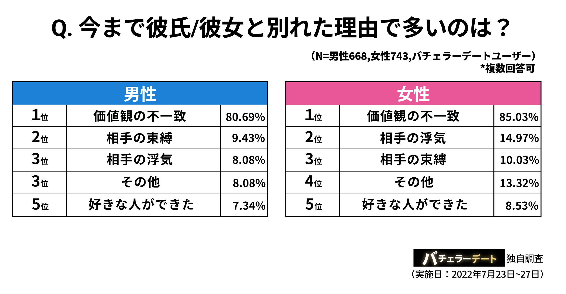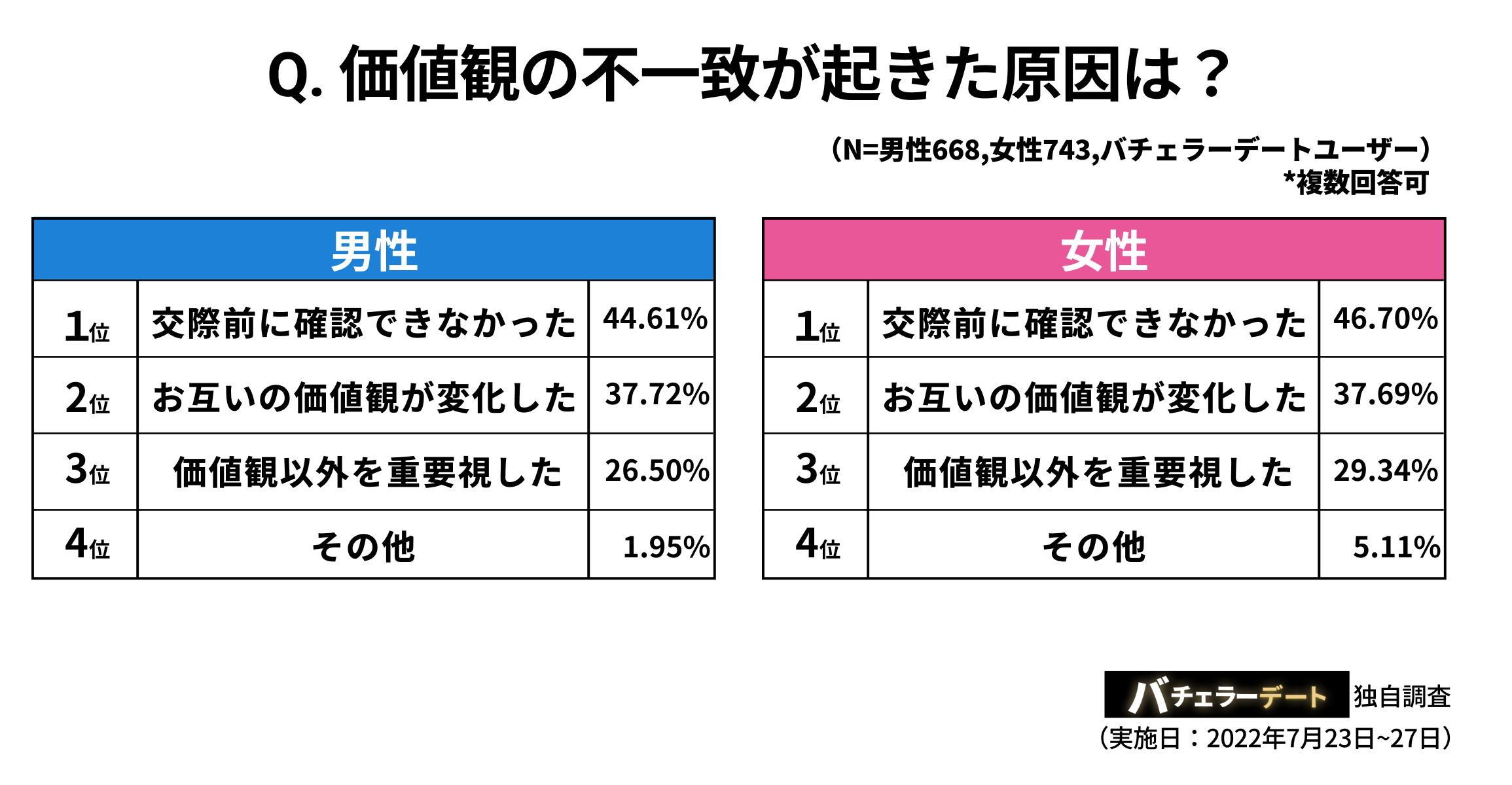 さらに、バチェラーデートの調査で、「価値観の不一致の原因」について聞いたところ、「交際前に確認できなかった」が約半数にのぼりました。具体的な意見に「金銭感覚や物事の考え方のギャップがあった」「思ったよりもコミュニケーションが面倒だった」などがありました。