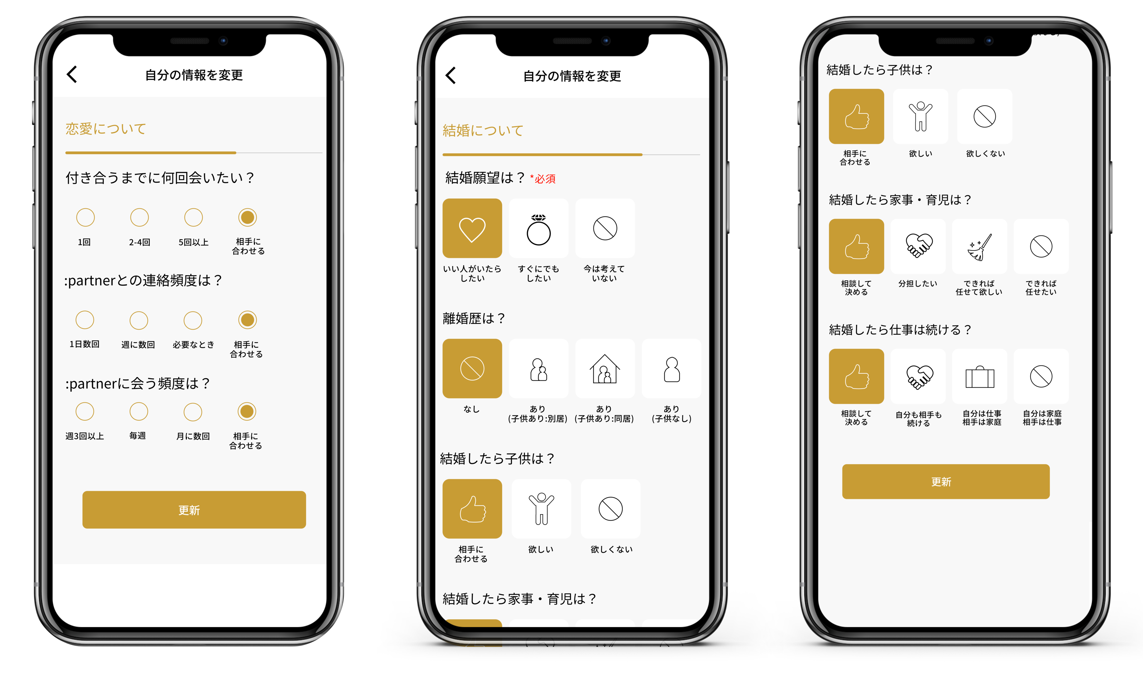 バチェラーデートは、持続可能な関係を築くために特に重視される価値観、『連絡の頻度/会う回数(恋愛観)』『結婚観』『趣味』にフォーカスをし、従来のAIマッチング機能と掛け合わせ、恋愛観から結婚観まで網羅したAIによる細かい「価値観マッチング」機能を追加しました。これにより、より良い価値観の合うハイスペックなお相手との出会いを提供していきます。