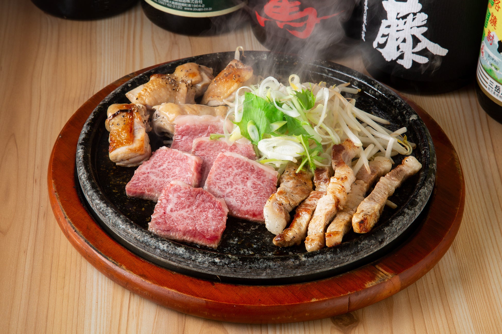 熱した溶岩石でお肉を焼くと、遠赤外線を放出し内部から加熱されるため柔らかく仕上がります!鹿児島が日本に誇る黒毛和牛、黒豚、黒さつま鶏を是非ご堪能ください!ハーフサイズ:2,000円(税込)