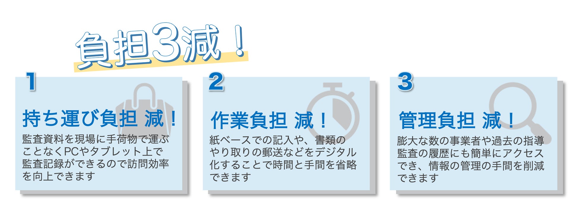 現在、多くの自治体では紙ベースで福祉施設(特別養護老人ホームや保育所等)への指導監査が実施されており、全施設への監査実施には到底手が届いていないのが実態です。『監査くん』を導入することにより、指導監査業務をオンライン上で一元管理し、監査業務の効率向上や事業者の負担軽減を支援することができます。監査実施率の向上や事業者の安心・安全な運営、そして施設利用者の生活の質の向上に貢献します。