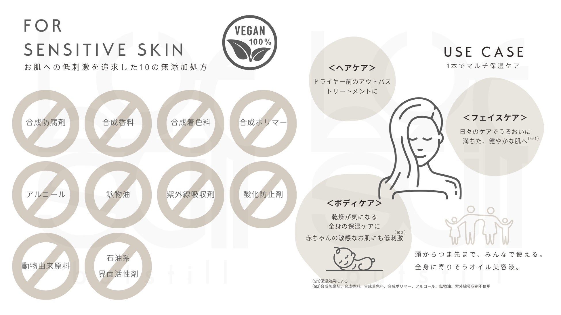 濃厚なはずなのに、少量でスルスルと肌に溶け込むように馴染む、軽い使用感が自慢です。これまでの「ベタベタ・ギトギト」するといったのオイルのネガティブなイメージをくつがえします。