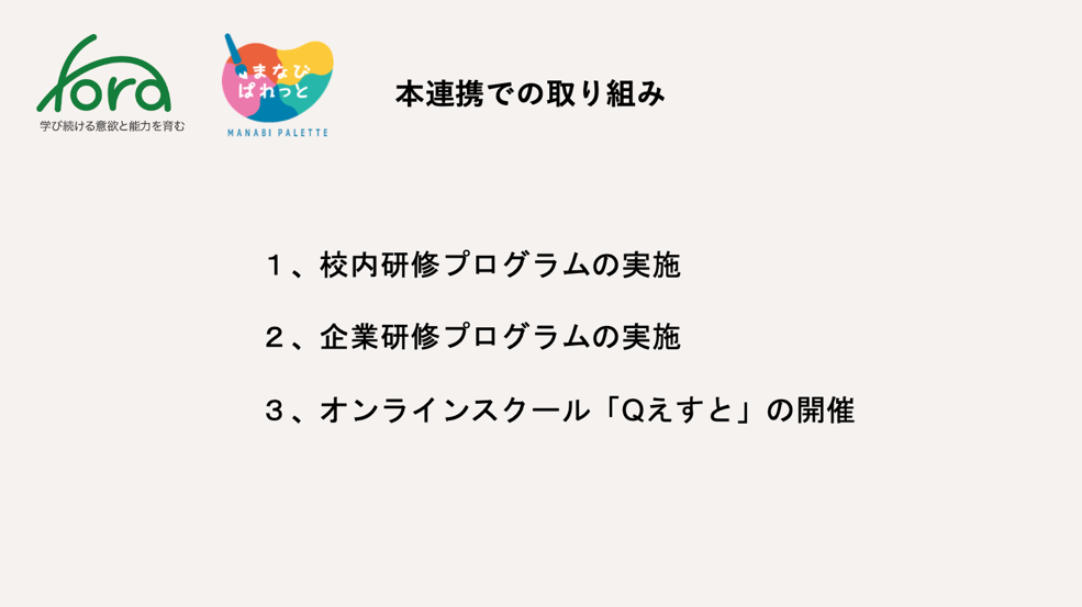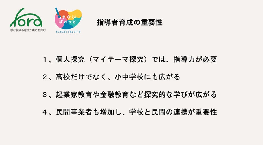 一般社団法人Fora(本社:東京都中央区、代表理事:藤村 琢己、以下 Fora)は、一般社団法人まなびぱれっと(本社:東京都港区、代表理事:小泉 志信、以下まなびぱれっと)と連携し、生徒一人ひとりがテーマを定め、問いを持ち、仮説検証型の探究の指導者育成を行うプログラムを実施いたします。校内研修や教育委員会等での研修プログラムの提供に加え、企業等への研修プログラムを提供するほか、広くオンライン研修を開催いたします。