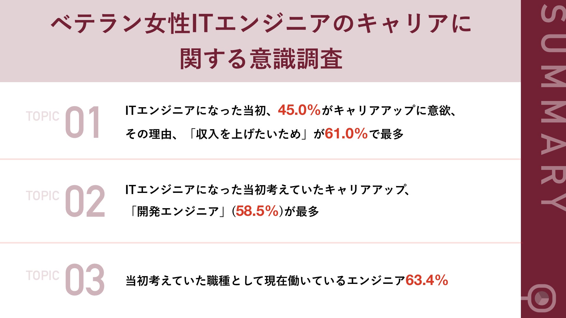 【ベテラン女性ITエンジニア、自身のキャリアをどう考えている?】45.0%が「キャリアアップ」に意欲 キャリアアップ先は「開発エンジニア」が最多で58.5%