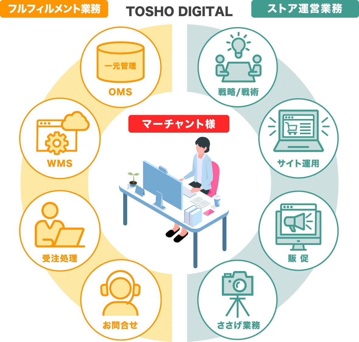 本サービスは、ECサイトの運営に伴う受注管理、発送作業、在庫管理等の物流業務とカスタマーサポート(CS)業務をワンストップで支援するものです。