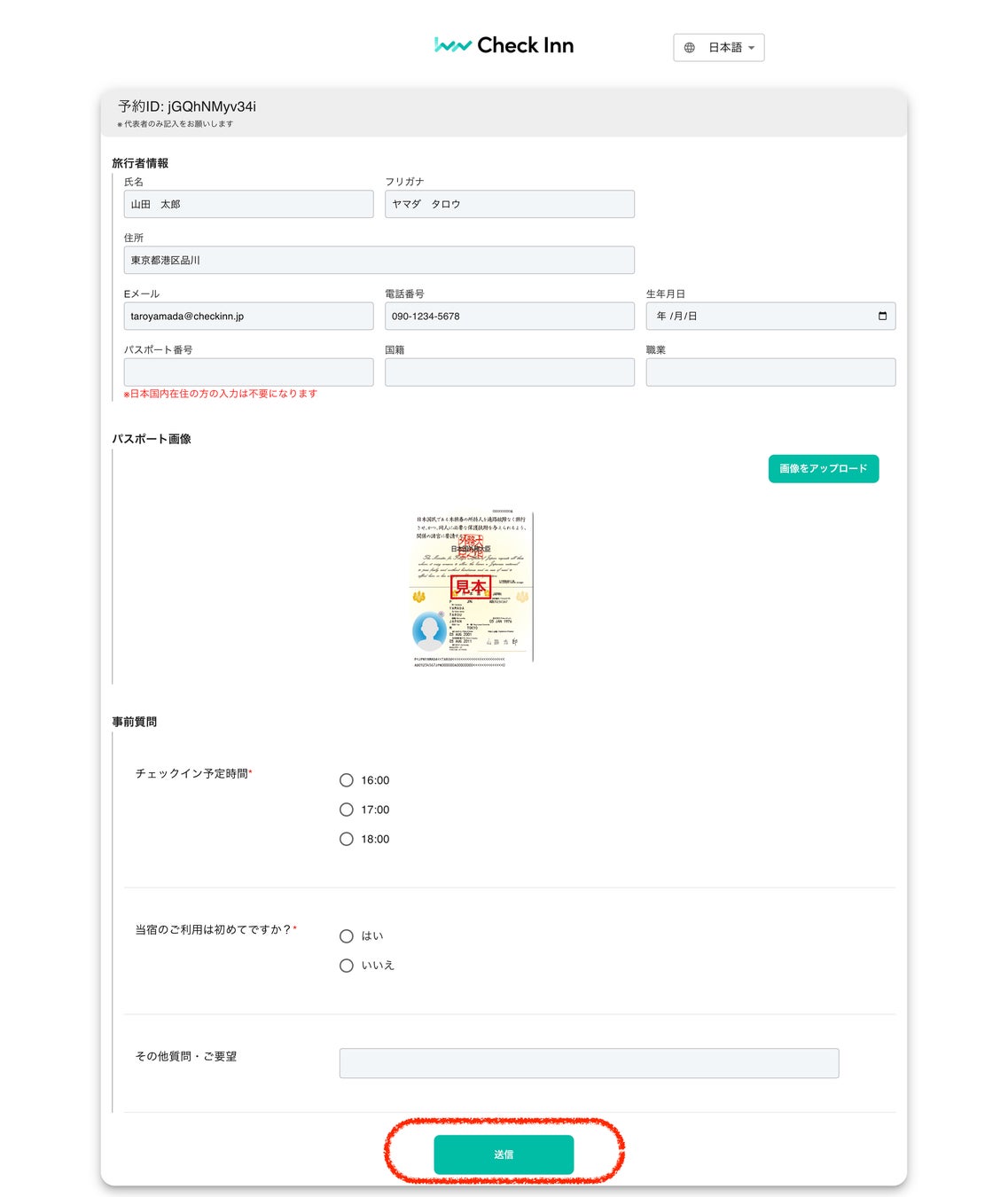 ③予約確認メールを受け取った予約者が、URLをクリックし個人情報の入力やパスポートの画像登録をし、送信ボタンをクリック
