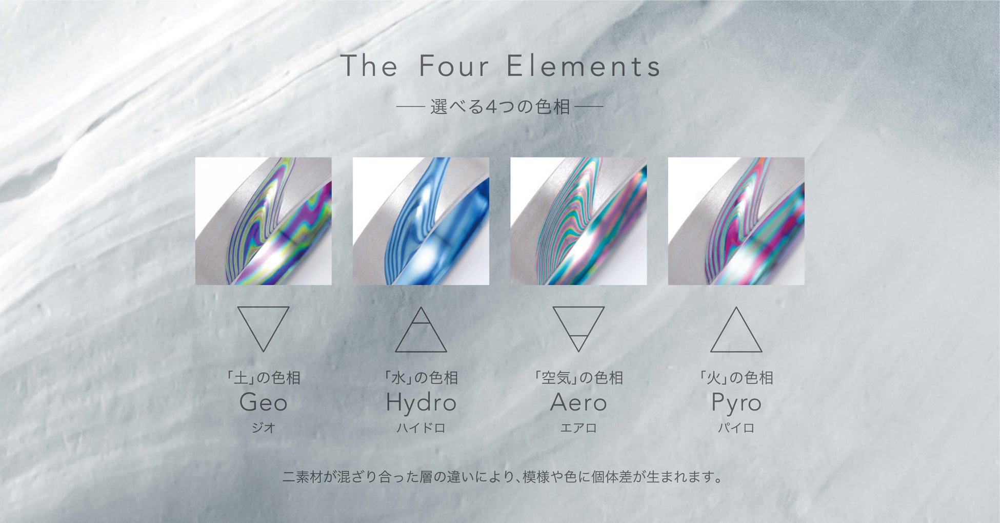 Geo(ジオ/土・紫系)、Hydro(ハイドロ/水・青系)、Aero(エアロ/空気・緑系)、Pyro(パイロ/火・ピンク系)