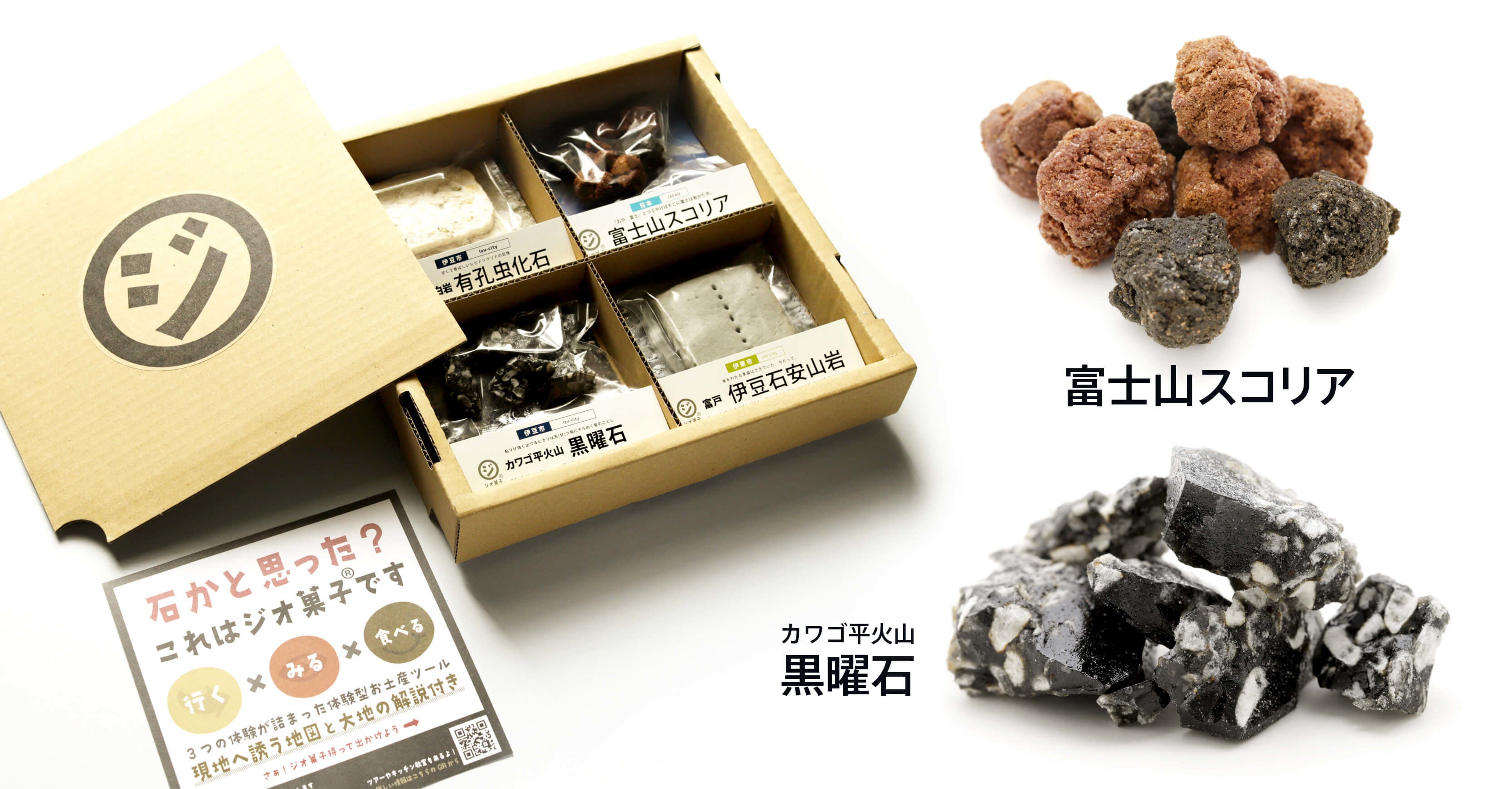 自然の造形が語るストーリーを伝える活動をしている「ジオガシ旅行団」のジオ菓子をご成約特典としてプレゼント(ジオガシ旅行団:https://geogashi.com/)