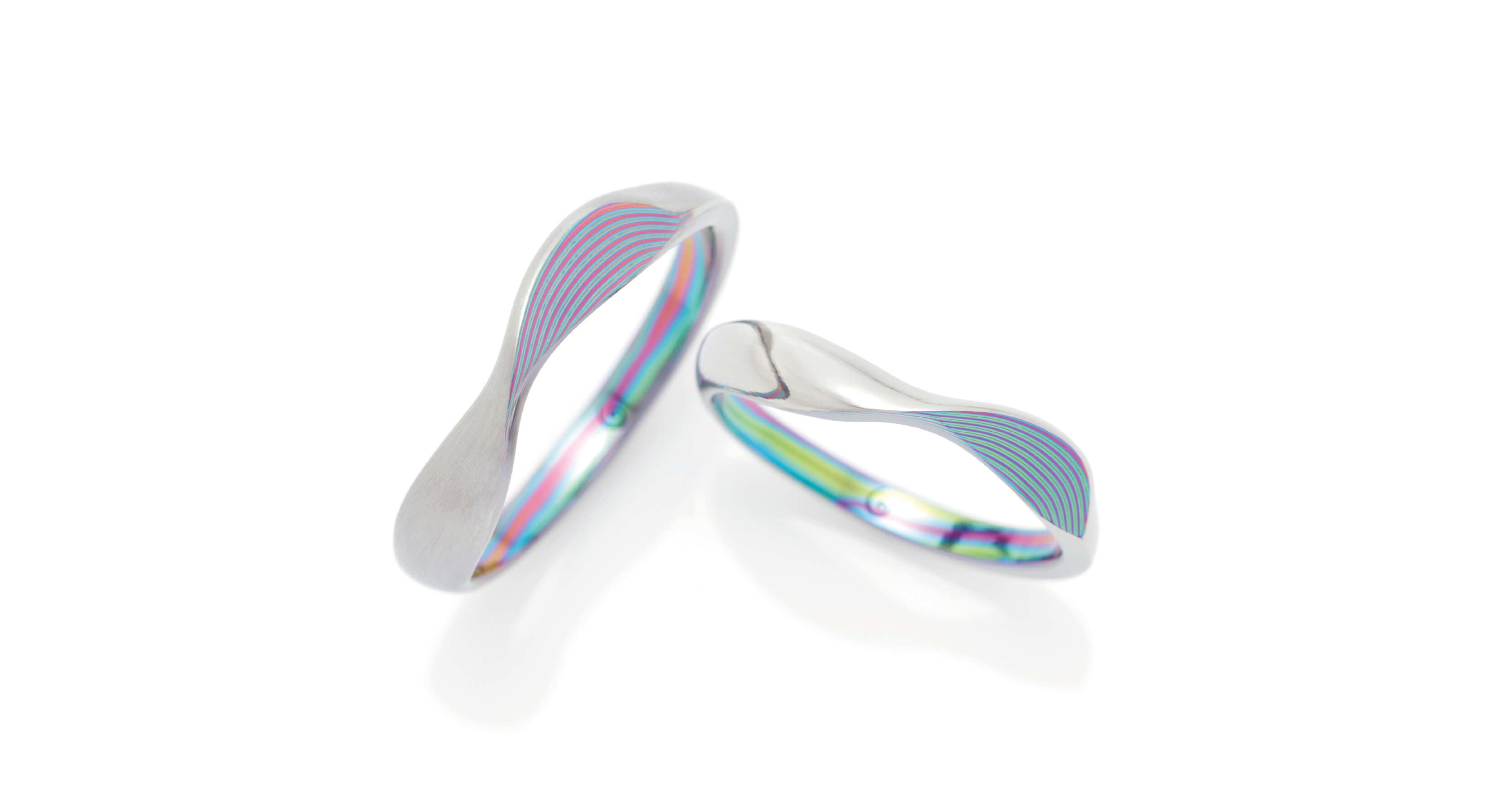 繋ぎ目のない木目金技術は2009年に特許を取得しましたが、木目柄の再現の難易度が高く数多く制作することが困難なことから直営店のみ受注が可能でした。長年このテラメタルの魅力をもっと広めていきたいと考えており、安定した柄の出し方について技術開発を繰り返しながら、ついに雄大な大地の積層を想わせる柄を作り出すことに成功し、正規取扱店でも受注を開始することとなりました。伝統的な木目金は、板状の金属をリング状にして溶接するため木目柄に繋ぎ目ができるのが一般的です。しかし、テラメタルは薄く引き伸ばしたリボン状のチタンとジルコニウムを同心円状に巻き付けるように接合する一体成形のため、繋ぎ目がありません。木目金特有の個体差は多少でますが、その指輪にしか現れない唯一無二の柄です。時代や地域によって違いが生まれる大地の積層に想いを馳せていただけるよう一点一点制作しています。