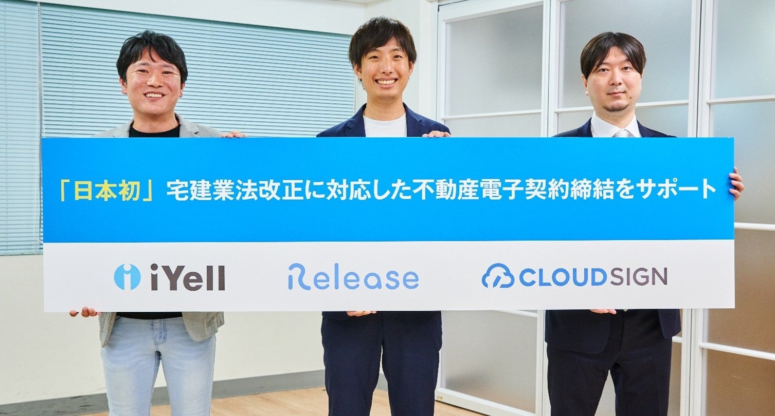 今般の不動産電子契約の締結は、当社が提供するレリーズ(開発完了済の一部機能)と、弁護士ドットコム株式会社が提供する電子契約サービス「クラウドサイン」を用い、iYell株式会社が仲介を行い実施されました。各社は今後も、共通する目標である、不動産関連取引のオンライン化や住宅売買のDX推進を通じた付加価値向上の実現に向け、それぞれの事業において邁進して参ります。