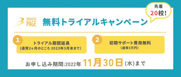 ご案内した学校から「まずはしっかりと操作性を試してから導入したい」「まずは全ての部活動で試してみたいけど、2ヶ月間で初期設定から運用開始するのは厳しい」とのご意見を頂きました。弊社も、まずは気軽にBukatsu Pageに触れて頂いて、できる限り多くの部活動で活用して欲しいと考えておりますので、十分な期間お試し頂いた上で納得されて導入して欲しいと思い、今回のキャンペーンを実施することに至りました。