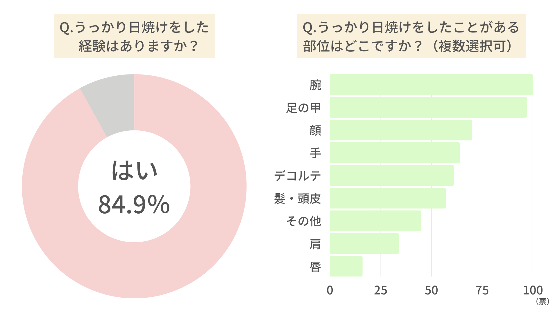 「うっかり日焼けをしたことがある部位はどこですか?(複数選択可)」と尋ねたところ、1位「腕」(100票)、2位「足の甲」(97票)、3位「顔」(70票)という結果に。次いで「手」(64票)、「デコルテ」(61票)、「頭・頭皮」(57票)と続きました。
