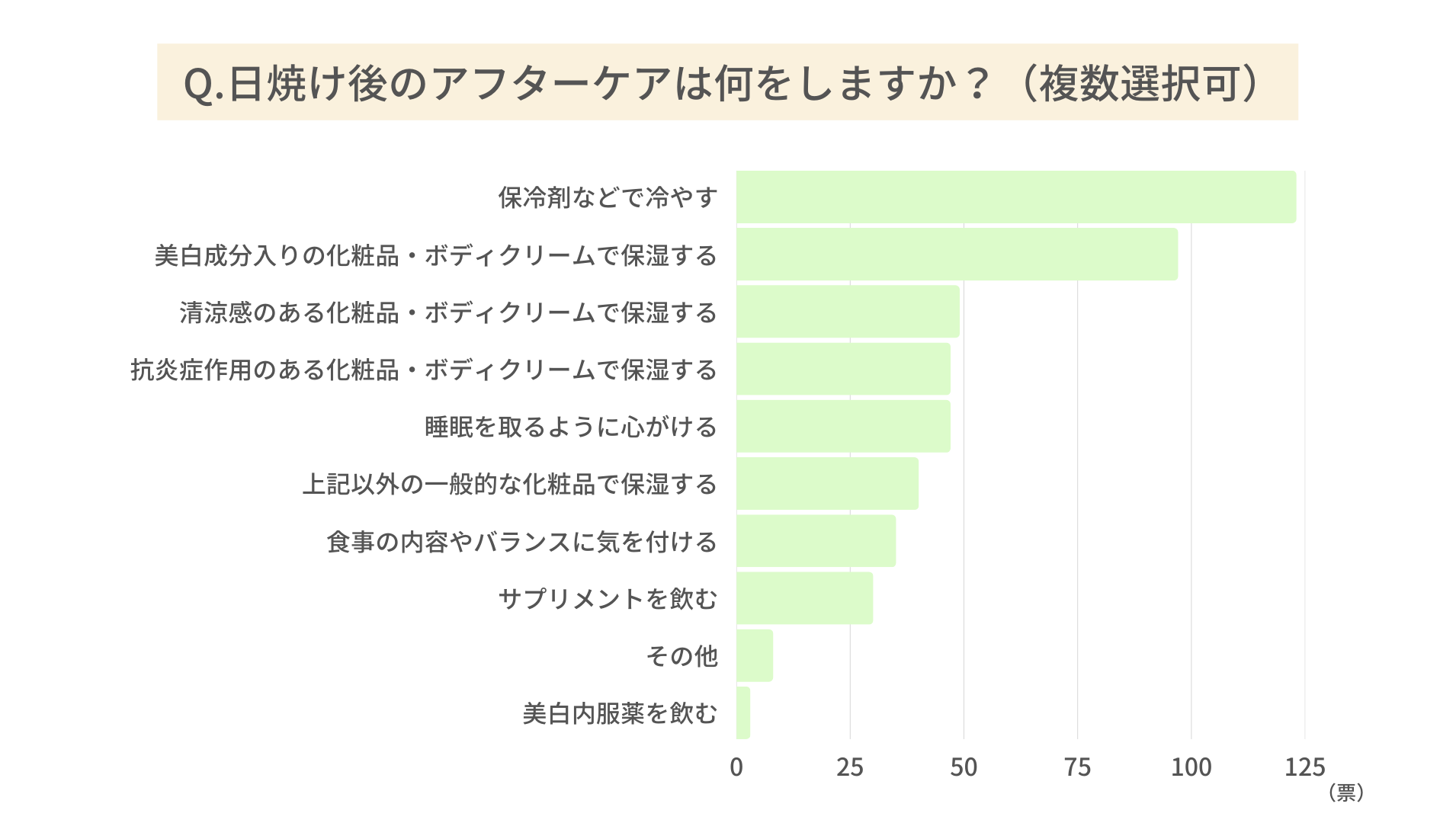 実際に取り組んでいる対処法(複数回答可)の中で、もっとも多かったものは「保冷剤などで冷やす」(123票)。次いで「美白成分入りの化粧品・ボディクリームで保湿する」(97票)でした。