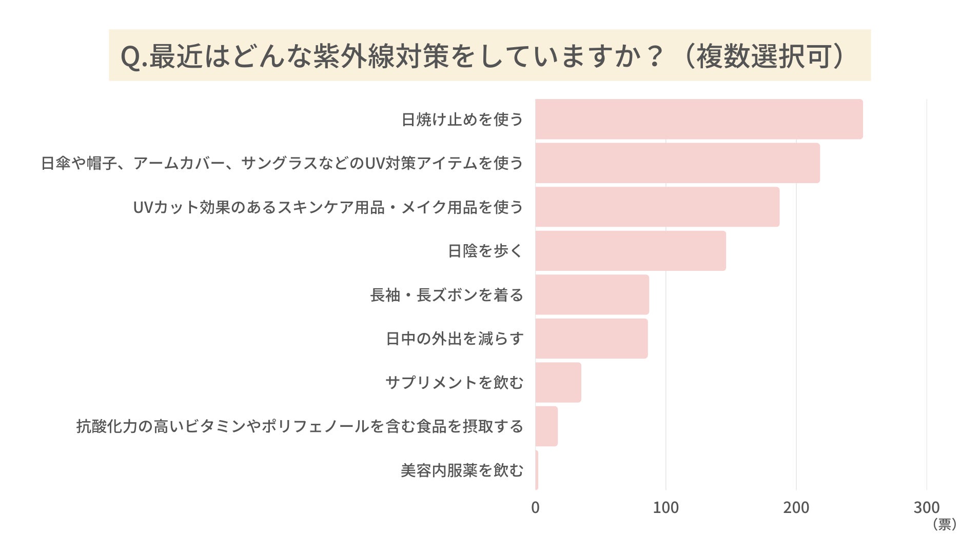 「最近の紫外線対策(複数選択可)」を尋ねたところ、もっとも多かったのは「日焼け止めを使う」(251票)でした。次いで「日傘や帽子、アームカバー、サングラスなどのUV対策アイテムを使う」(218票)、「UVカット効果のあるスキンケア用品・メイク用品を使う」(187票)、「日陰を歩く」(146票)という結果に。