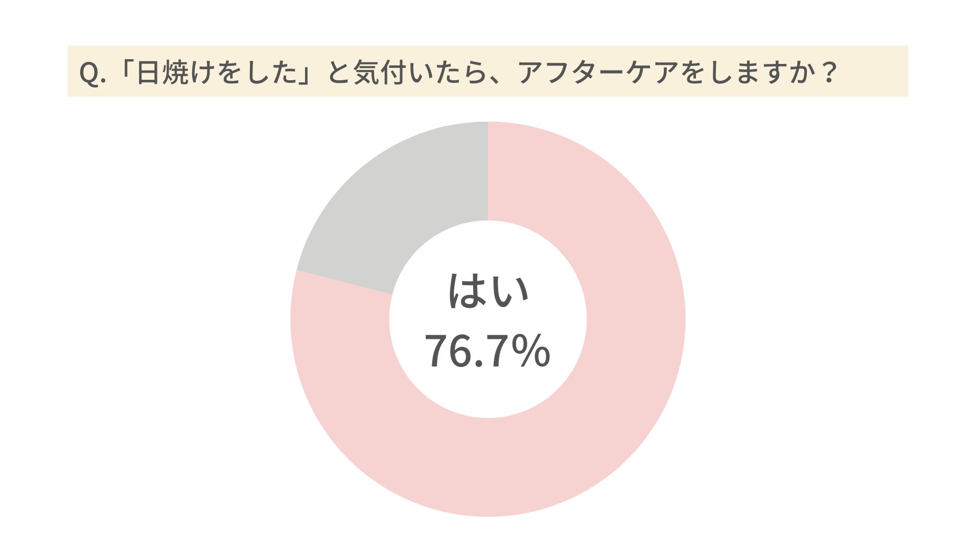 今回「「日焼けをした」と気付いたら、アフターケアをしますか?」とお尋ねしたところ、「はい」と回答した女性は76.7%。過半数の女性が日焼けのアフターケアをおこなっているとわかりました。