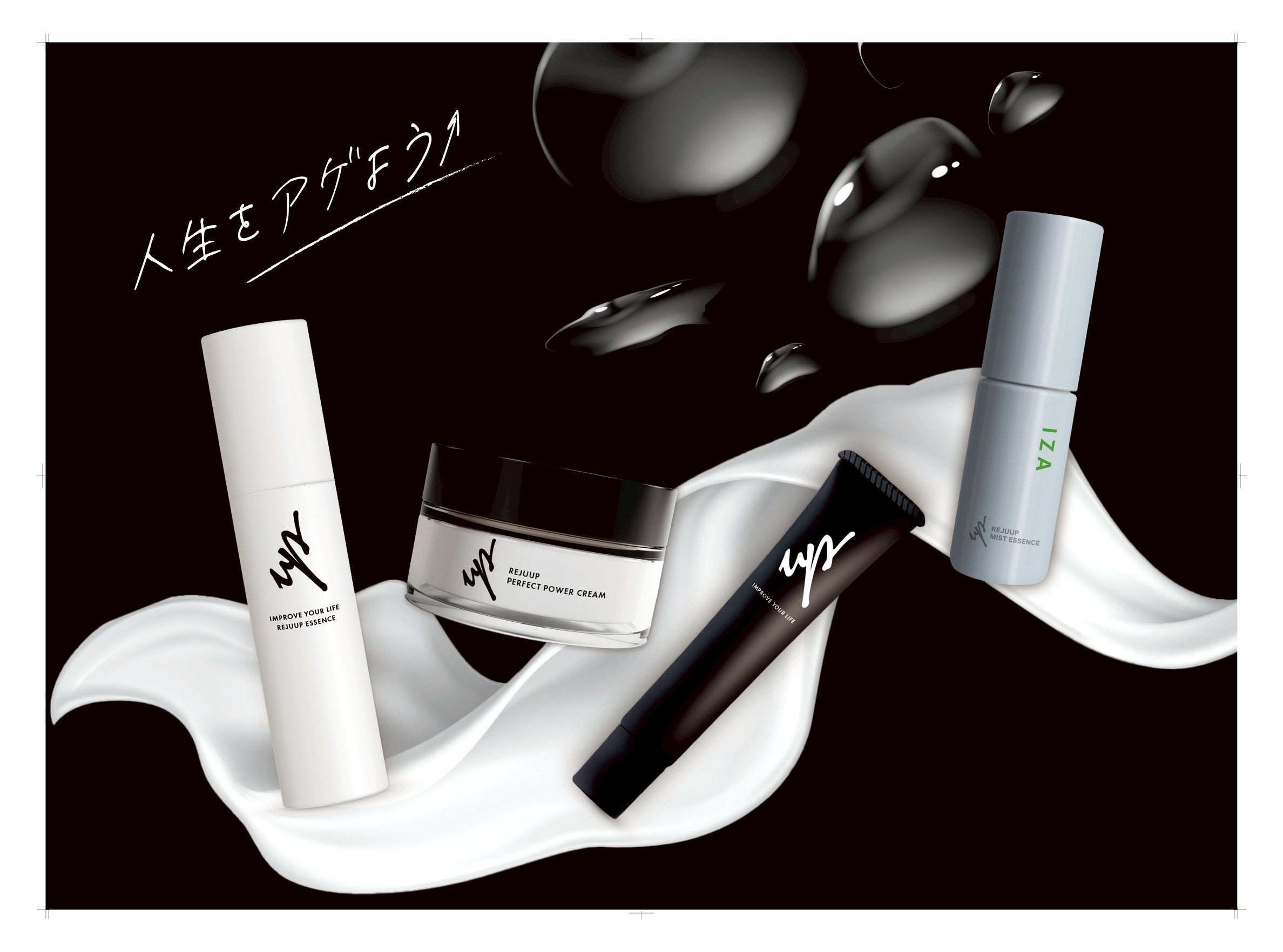 日常に寄り添う〈エッセンス(白)〉〈リフトエッセンス(黒)〉〈パーフェクトパワークリーム〉。