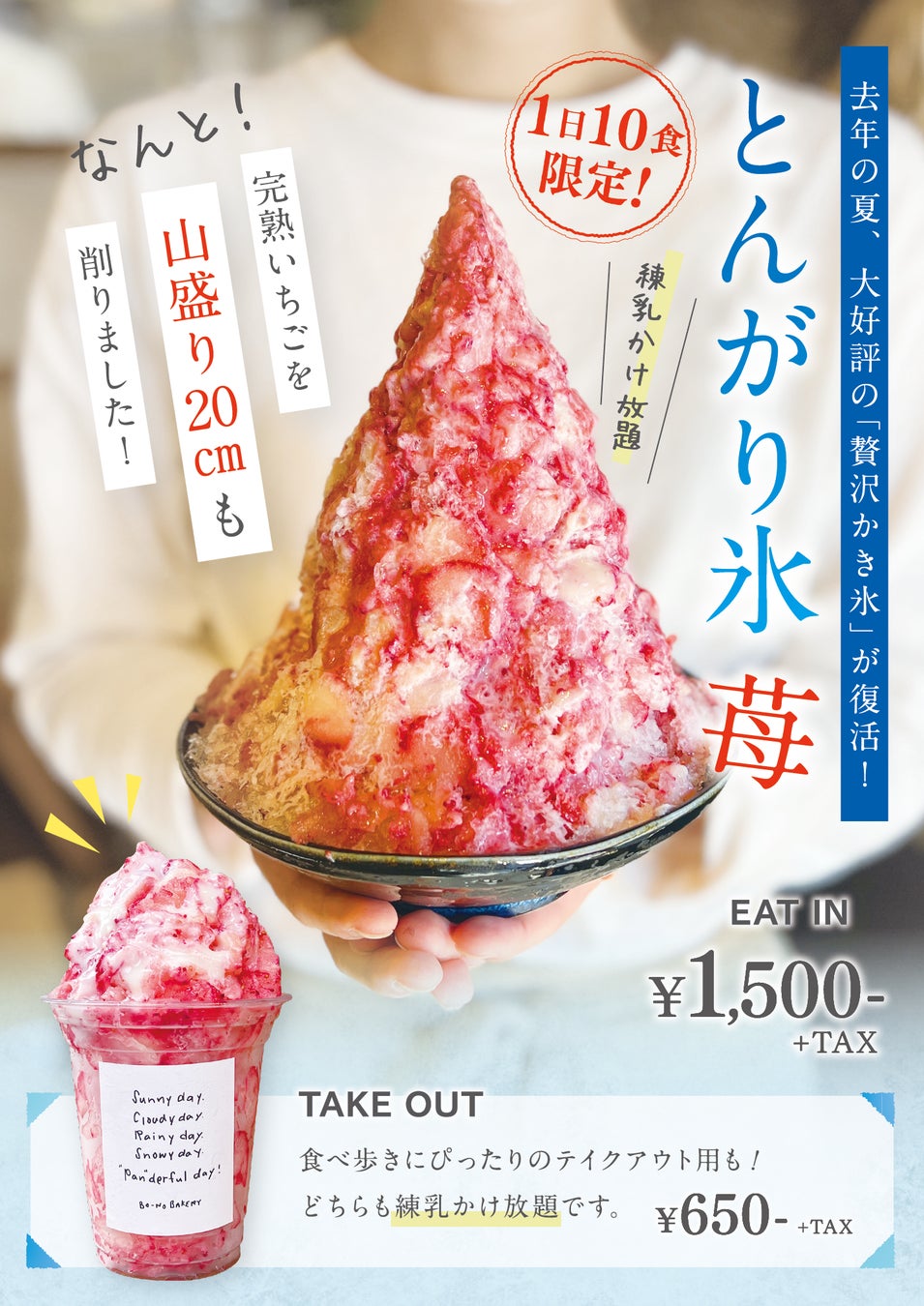 ボーノベーカリは2023年7月31日(月)より、店内でご飲食いただけるイートイン業態を夏季限定で開始いたします。今回新登場のイートイン限定販売「とんがり氷 苺」は販売前からSNSで注目が集まり、高さ20cmを超えるインパクトが話題に。