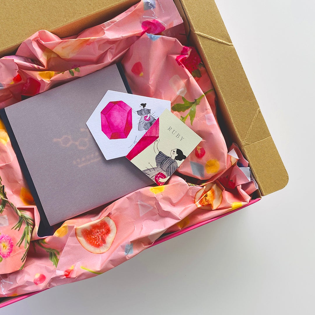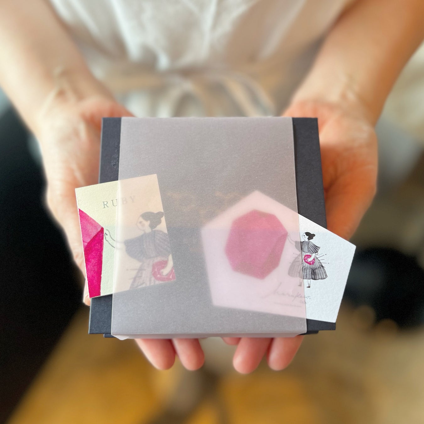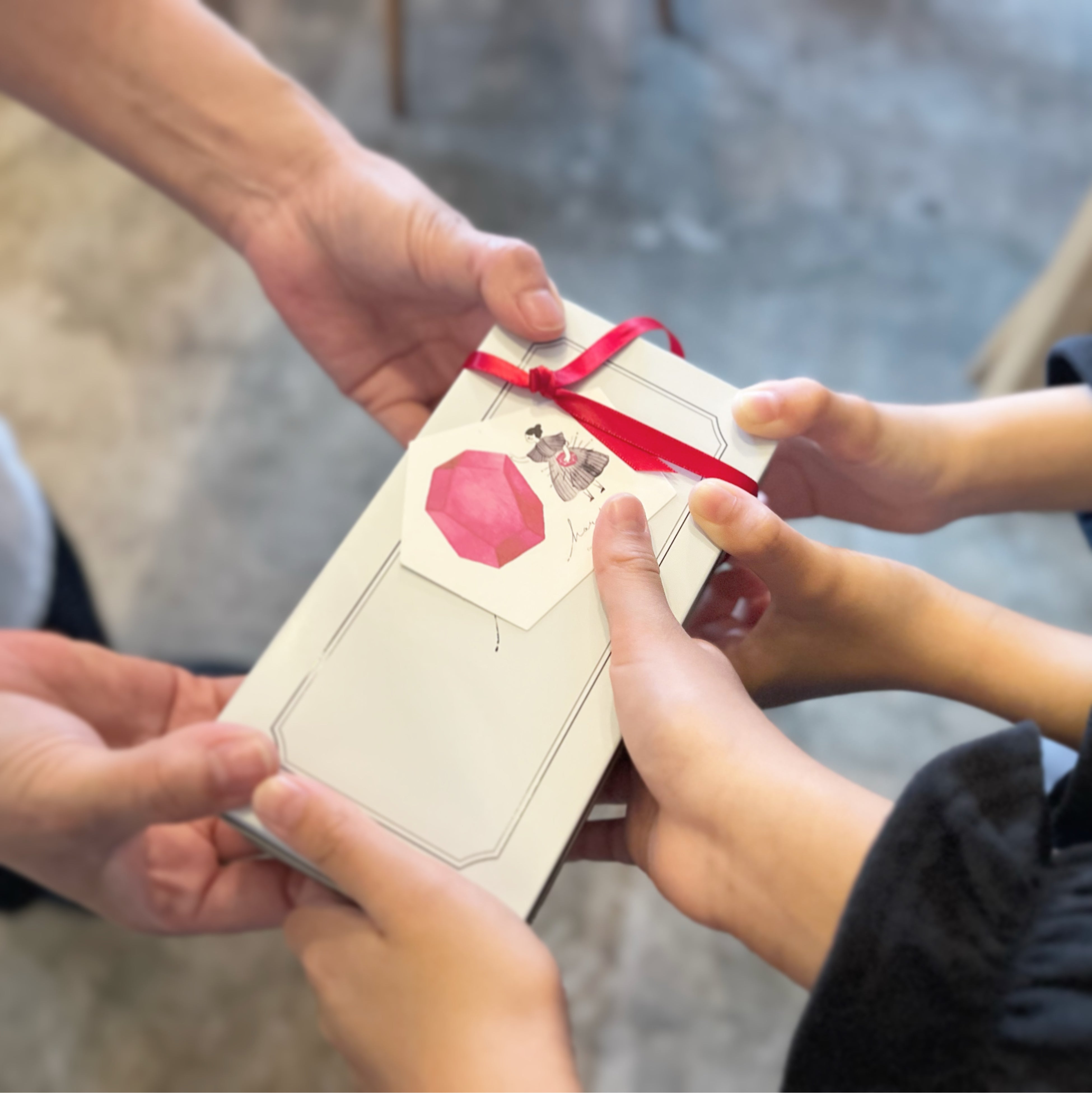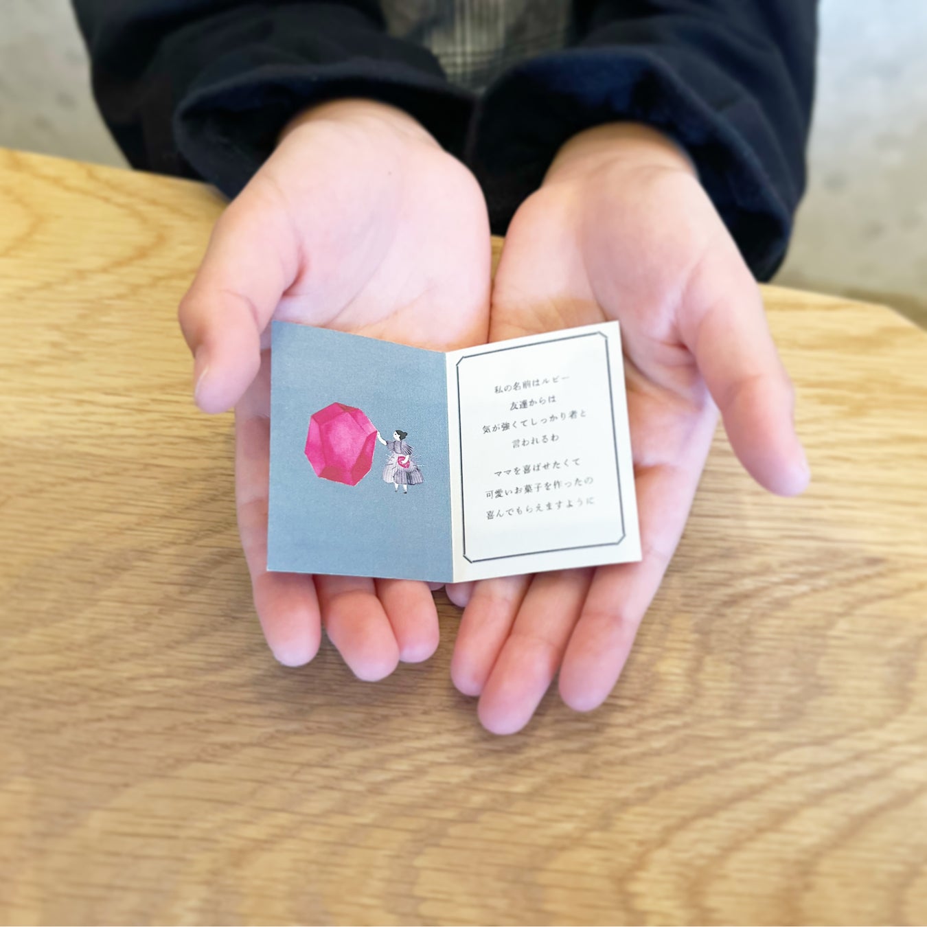 初登場はRUBYちゃん。どの作品にもRUBYちゃんCARDと小さな絵本がついてくる。外箱にもRUBYちゃんが登場、作品全体に一体感を出して、箱が届いた時からワクワク、そして開けてもワクワク、食べてもワクワク。沢山のワクワクをまとわせたいと思います。