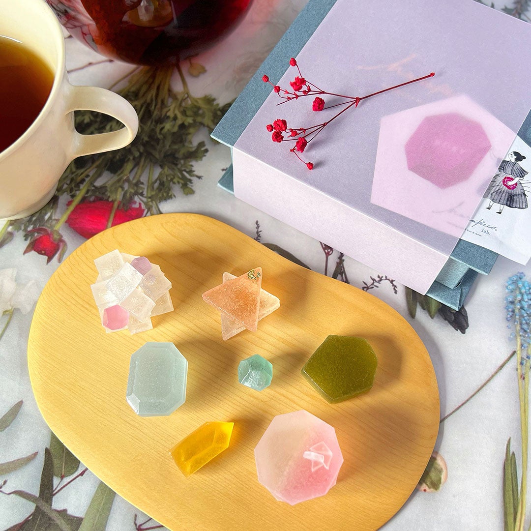 和菓子である琥珀糖とお茶が一度で愉しめるセット。3つのマス目にこうぶつヲカシと残り1マスにはカネロク松本園さんがこだわって丁寧に作り上げた和紅茶あかりのティーバッグ1包が入っています。