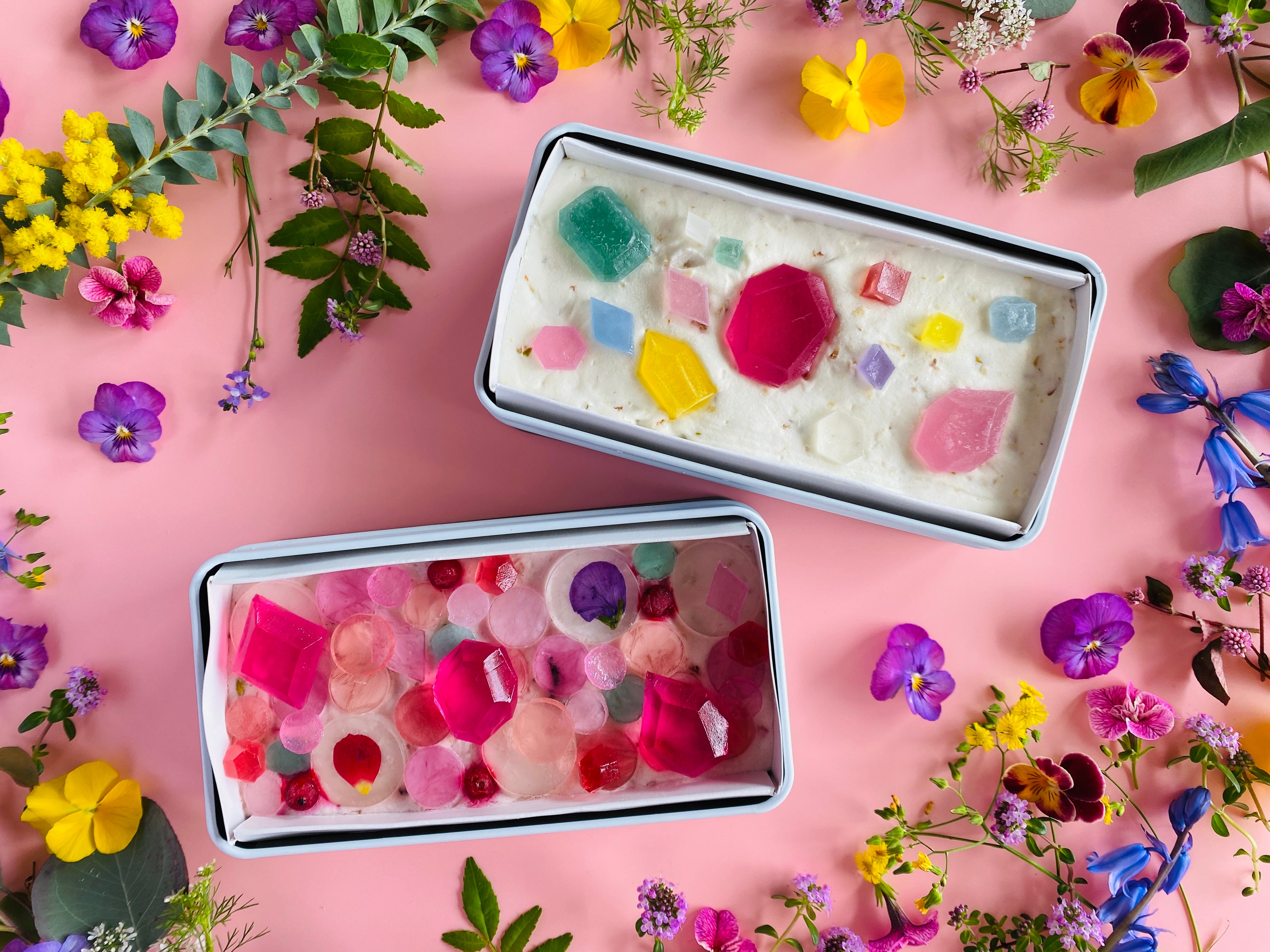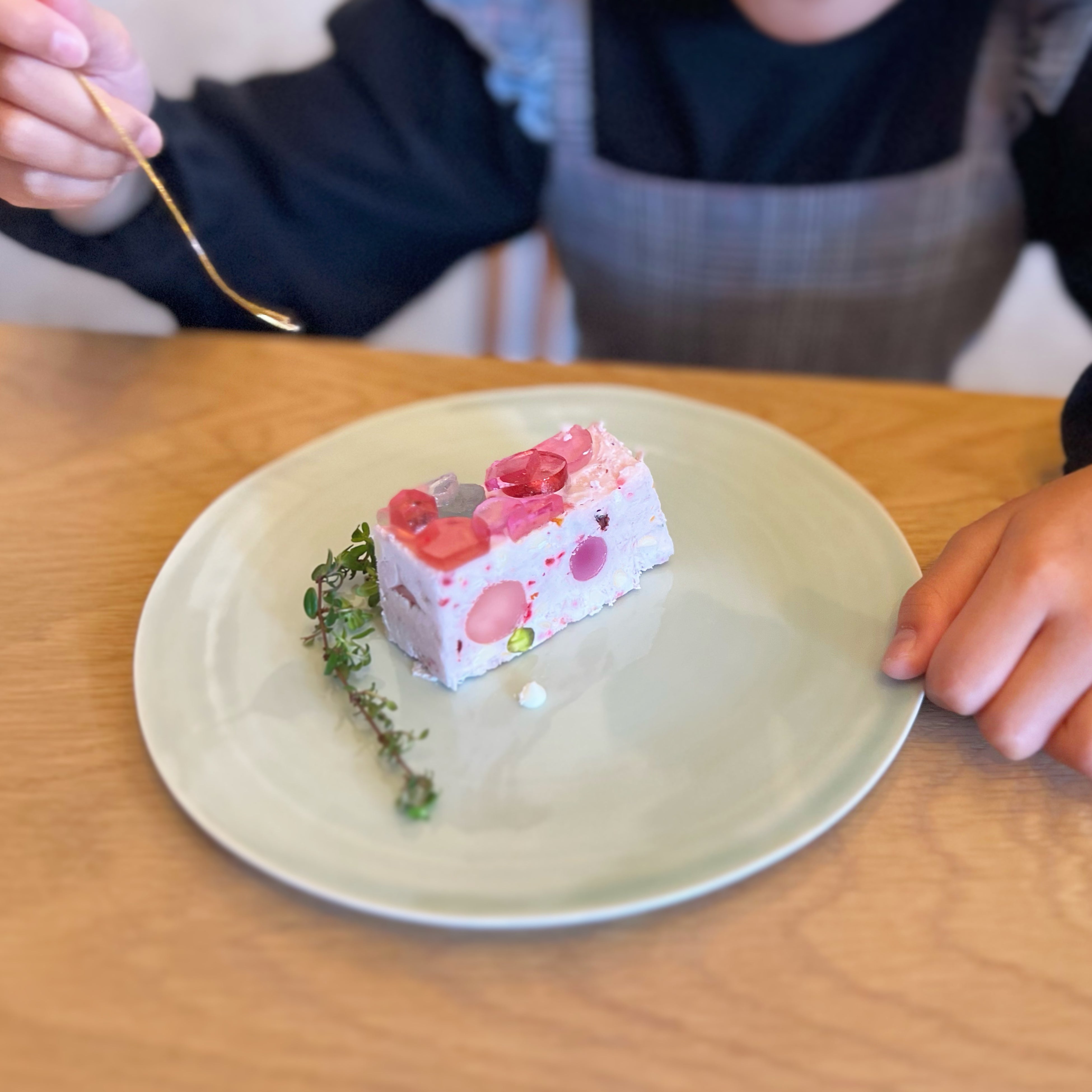 白いカッサータの中に、ハラペコラボが作る鉱物みたいな琥珀糖「こうぶつヲカシ」が隠れています。チーズとクリームの白に映える色味のこうぶつヲカシは、どこをカットしても断面が透明で光があたるとキラキラと輝く宝石のように美しい仕上がりになりました。