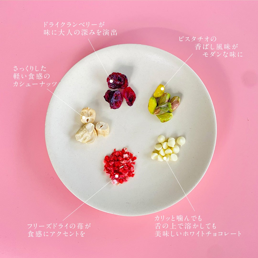 乳等を主原料とする食品(濃縮ホエイ、食塩)(イタリア製造)、砂糖、クリーム、フルーツピューレ(苺)、カシューナッツ、ホワイトチョコレート(砂糖、乳糖、ココアバター、全粉乳、植物油脂、脱脂粉乳)、オレンジピール、ドライクランベリー、ピスタチオ、乾燥果実(苺)、ラズベリーリキュール、寒天、シャンパン、グロセイユ、カシスリキュール、甘味果実酒(苺、糖類)、ピーチリキュール、ココナッツリキュール、洋梨リキュール、食用花/トレハロース、クエン酸、着色料(ビートレッド、スピルリナ青、クチナシ黄色素、アントシアニン)、香料、酸味料、酸化防止剤(亜硫酸塩)、乳化剤(大豆由来)、(一部に乳成分・オレンジ・カシューナッツ・大豆・ももを含む)