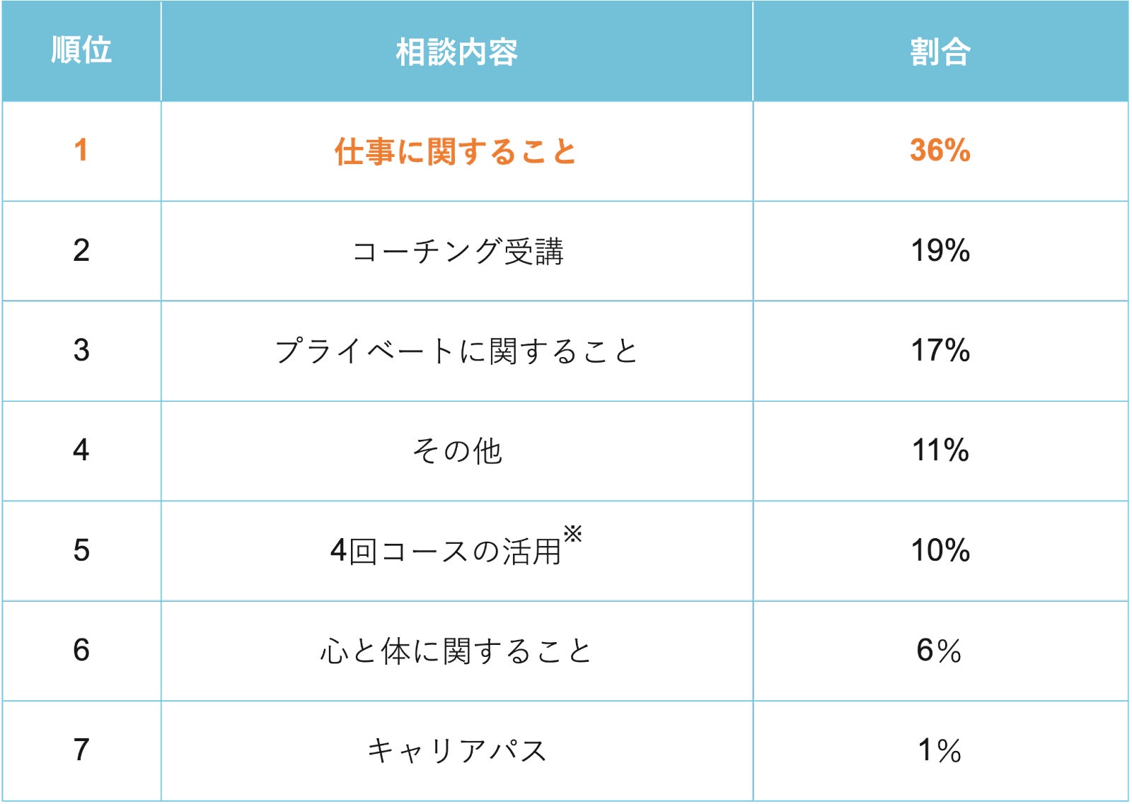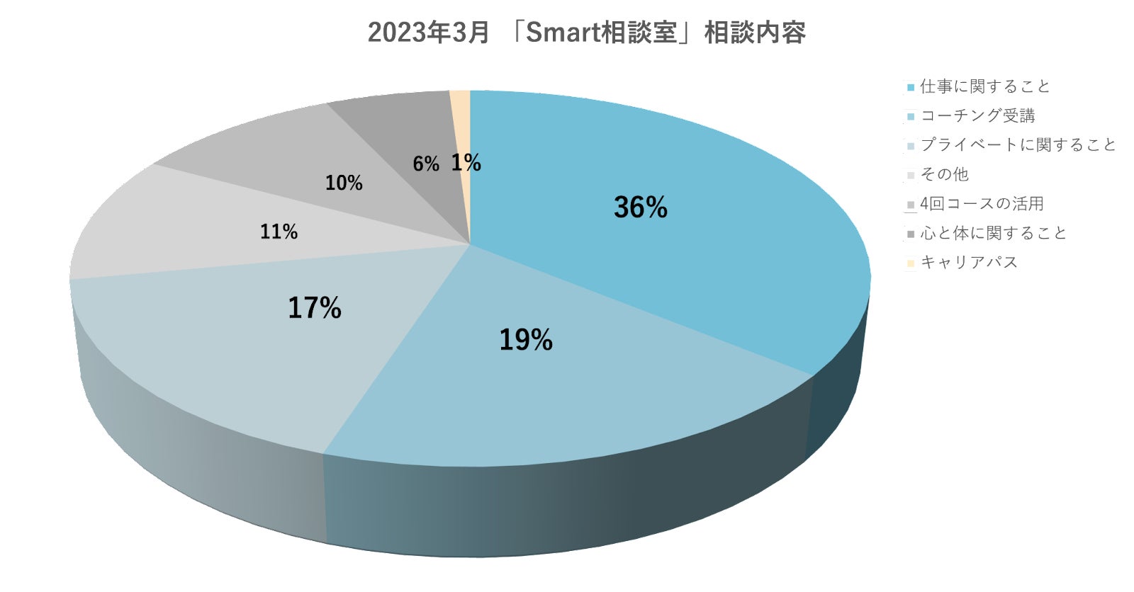 2023年3月の相談内容は、1位「仕事に関すること」36%、2位「コーチング受講」19%、3位「プライベートに関すること」17%