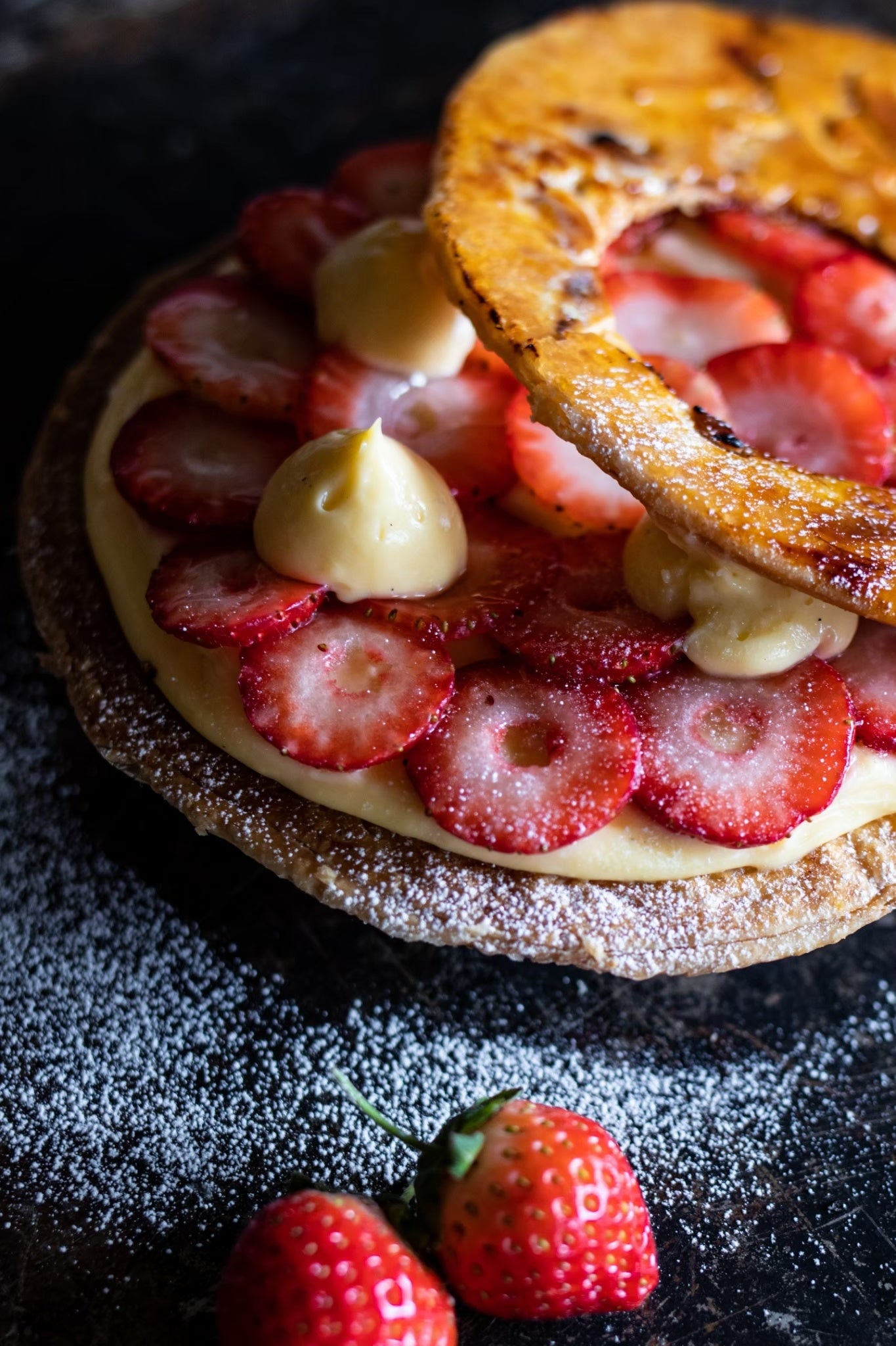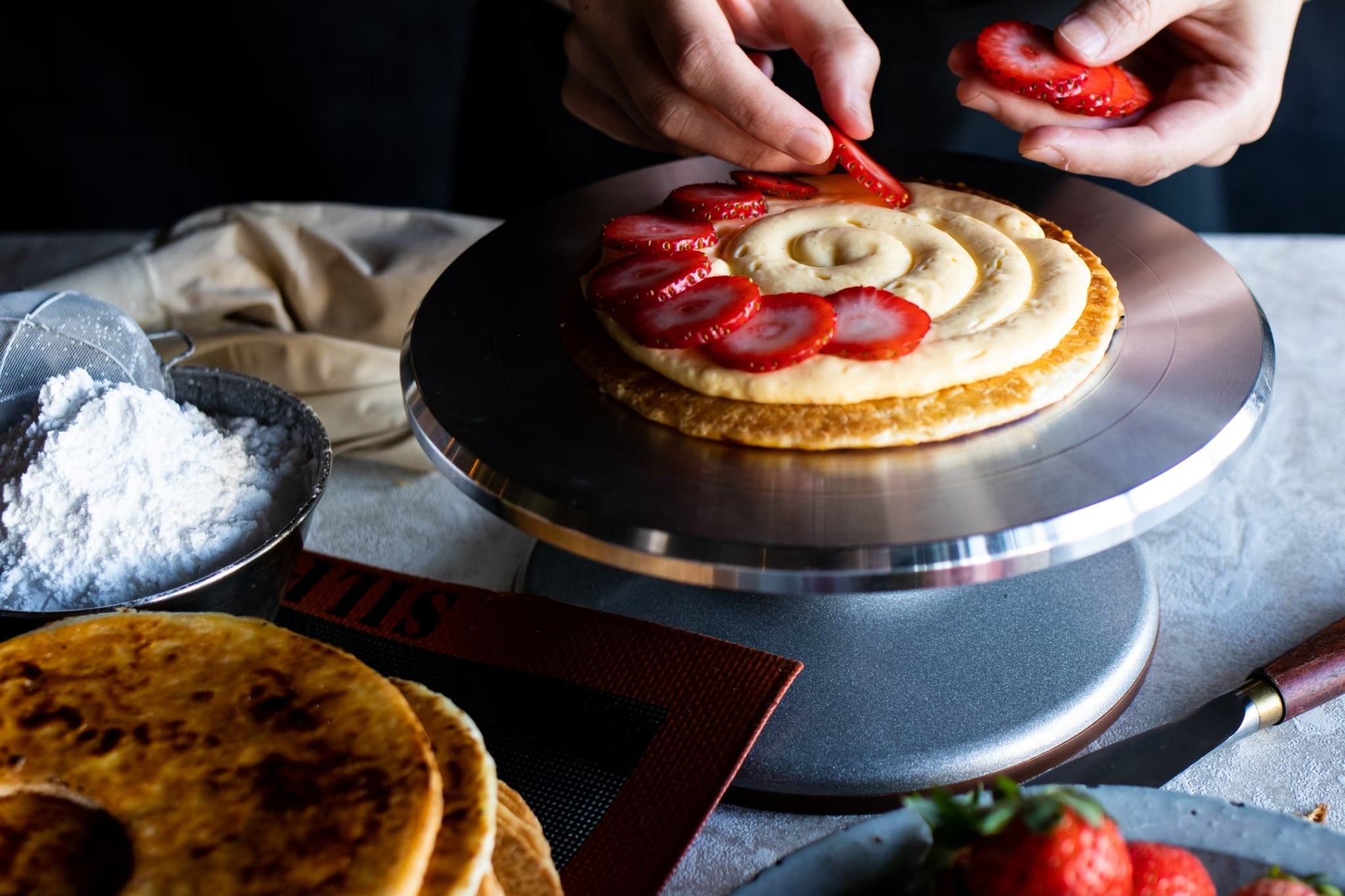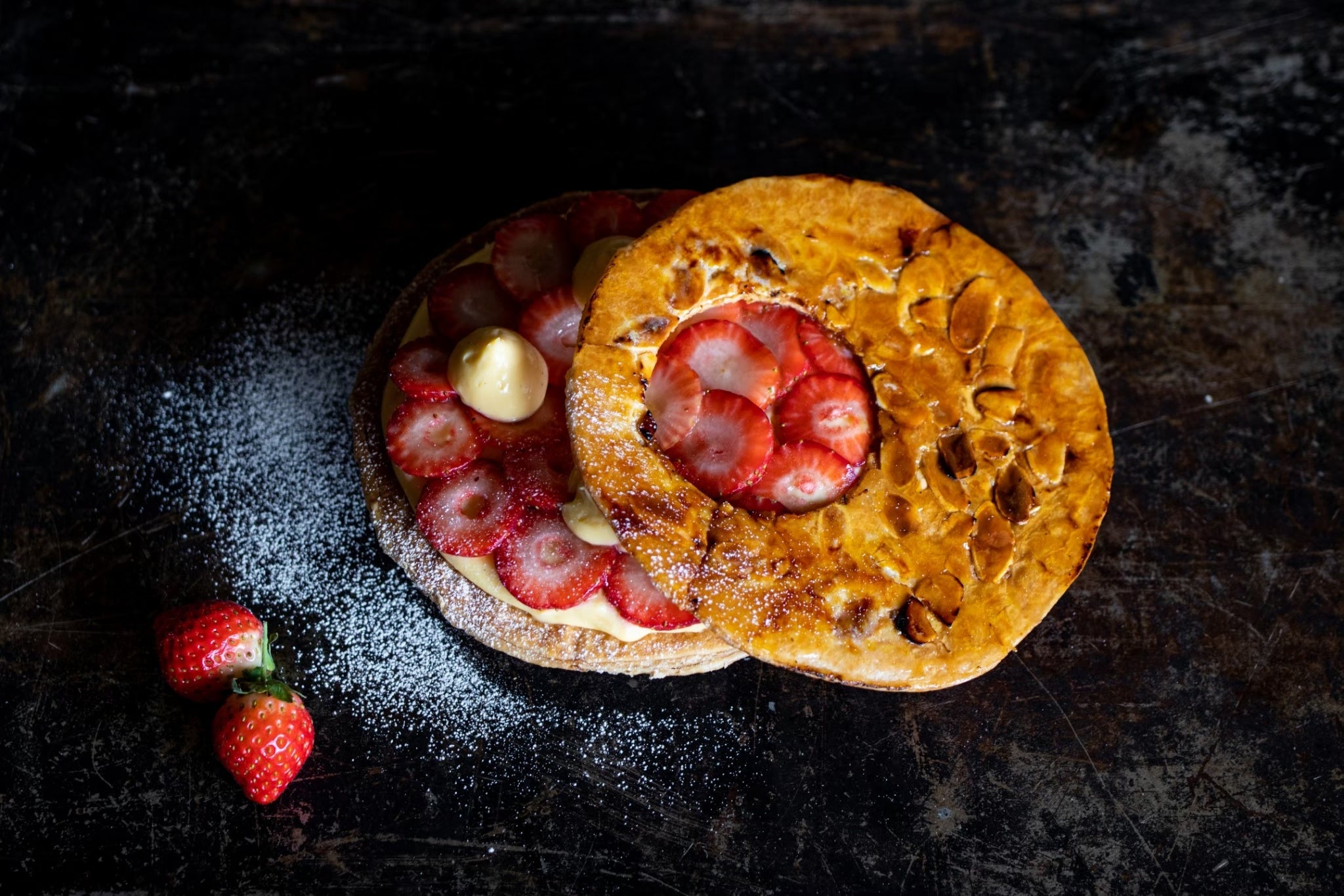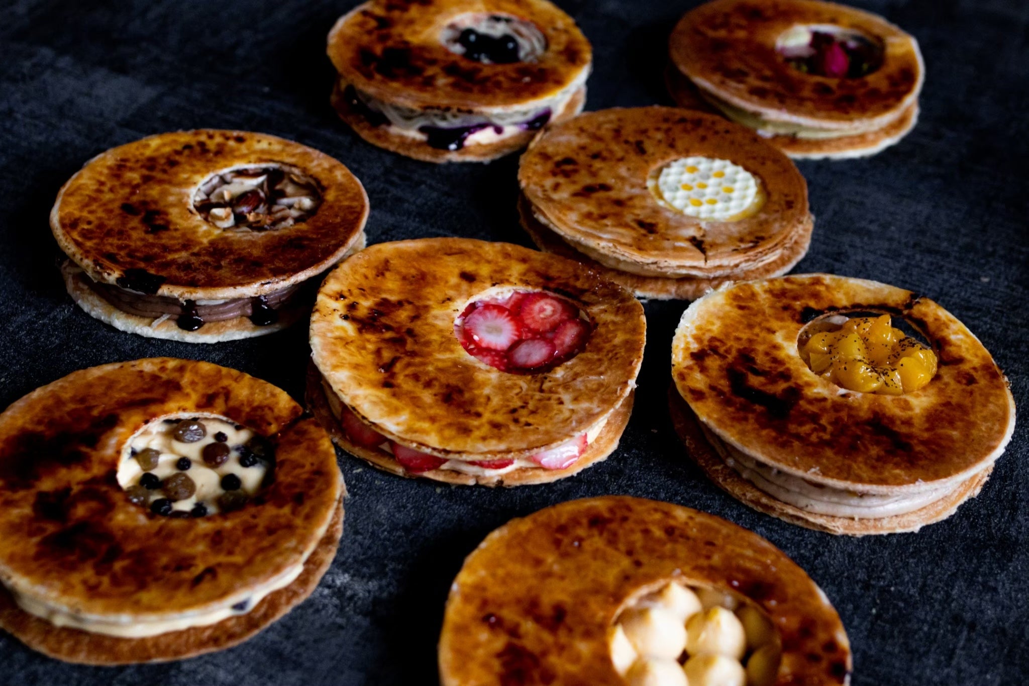 パイのサクサクとした触感やフレッシュな自家製カスタード、瑞々しいフルーツとの組み合わせを手軽に楽しんでいただきたいという想いから、独特の丸い形とライブ感ある工程に至りました。