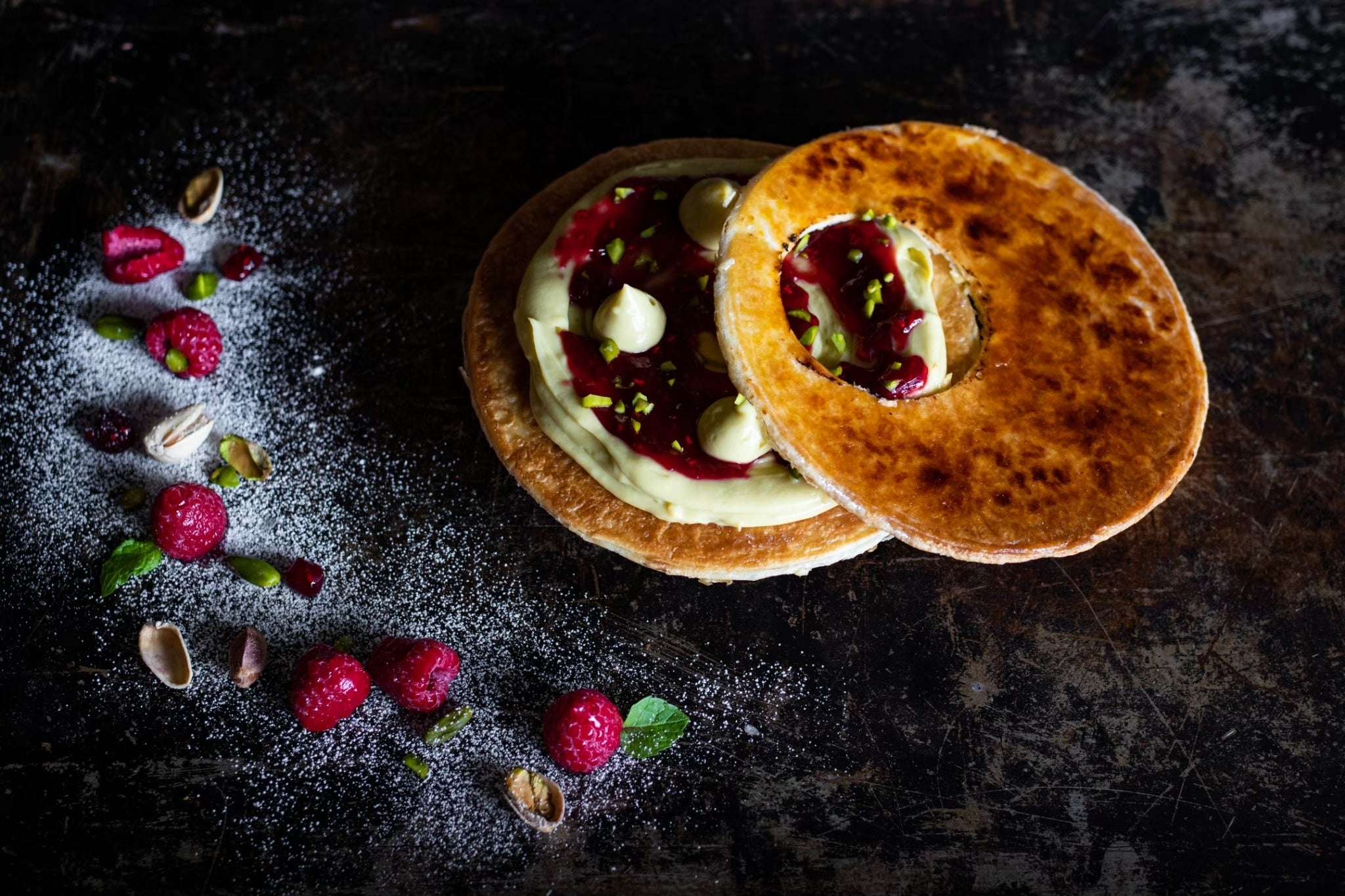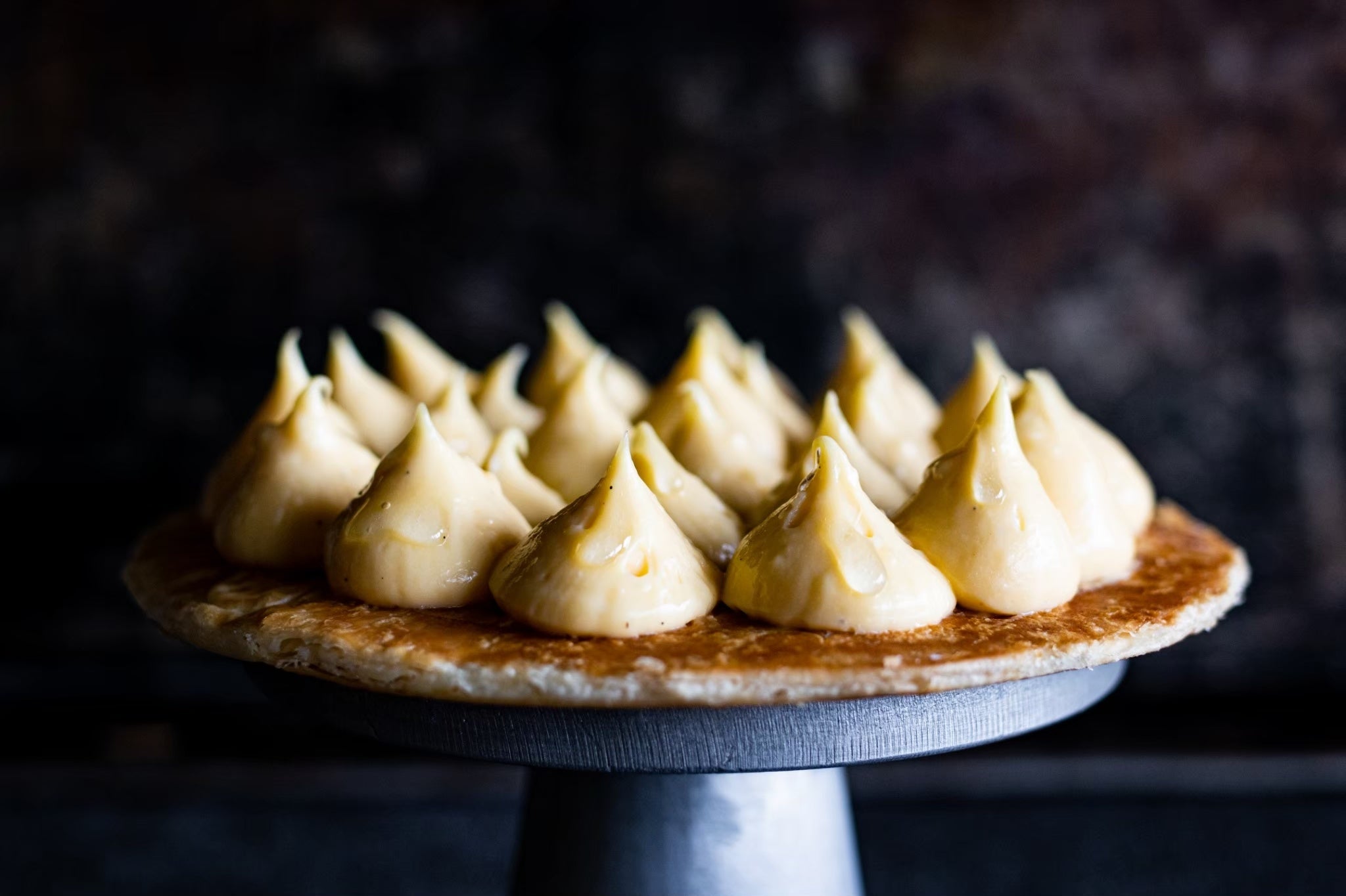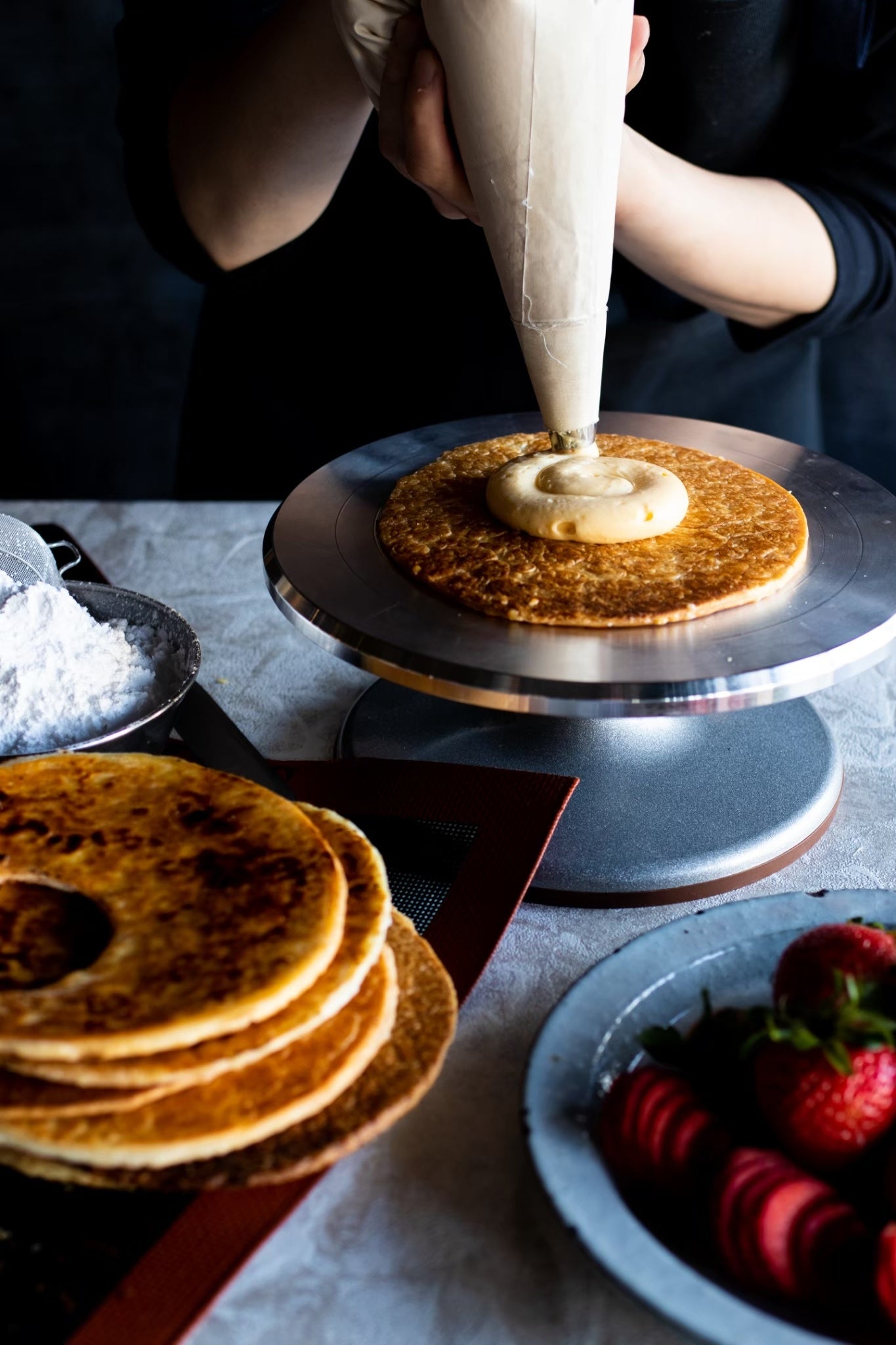 ミルフィーユからインスピレーションを得てつくられたパイ生地は、オリジナルのプレス機を用い高温短時間で焼き上げることで、香ばしい薫りと軽やかな食感を生み出します。