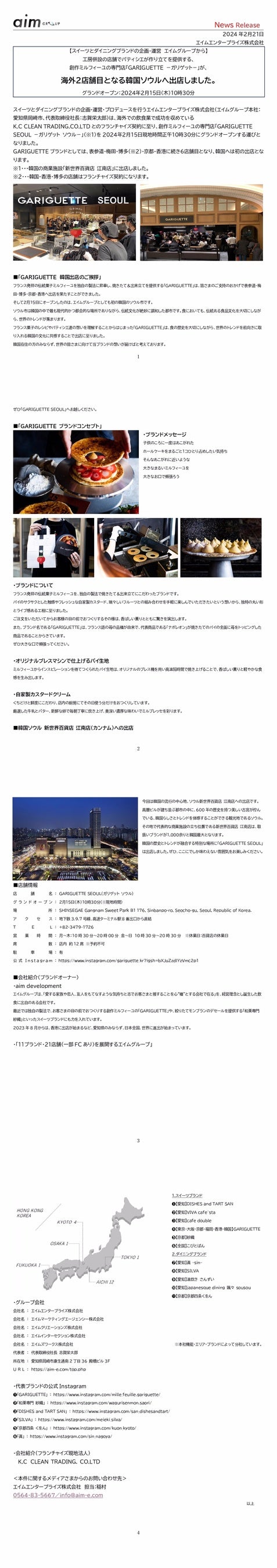 K.C CLEAN TRADING.CO.LTDとのフランチャイズ契約に至り、創作ミルフィーユの専門店「GARIGUETTE SEOUL -ガリゲット ソウル-」(※1)を2024年2月15日現地時間正午10時30分にグランドオープンする運びとなりました。