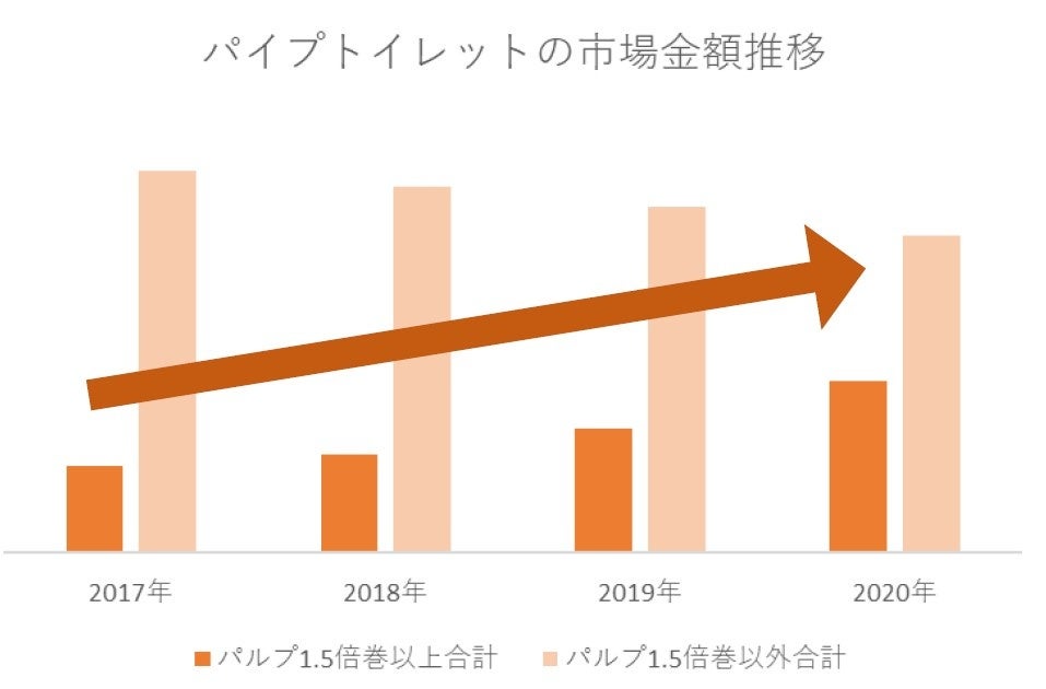 在宅時間の増加や、それに伴うまとめ買い需要・ネット通販の利用が拡大したことにより、買い物や交換の頻度が少なく済む1.5倍巻など、長尺タイプのトイレットペーパーが人気となっています。パルプトイレット市場の売上推移を見ると、1.5倍巻き以上の長尺タイプは新型コロナウイルス感染前と比べて138%増と急激に伸びました(右図)。外出しにくい状況が続くなか、今後も需要拡大が予想されています。