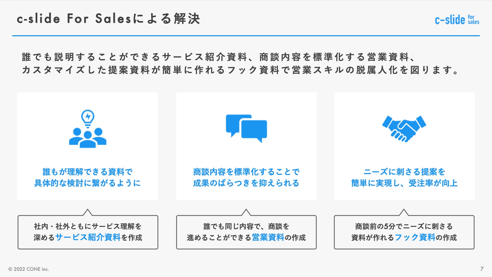株式会社CONE(本社:大阪府大阪市、代表取締役:佐藤立樹)が運営する資料作成代行サービス「c-slide」は、10月12日より、資料の改善を通して営業組織の標準化を支援するサービス「c-slide for sales」(https://cone-c-slide.com/sales/)を新たに提供開始いたしました。