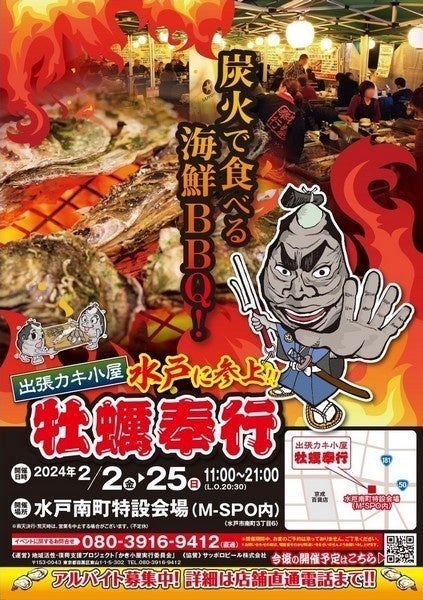 宮城県石巻の牡蠣をセルフ炭火焼き(海鮮BBQ)で楽しむ「出張カキ小屋 牡蠣(かき)奉行」(TEL 080-3916-9412)が2月2日、水戸南町特設会場(M-SPO茨城ロボッツ敷地内)に期間限定オープン。期間は2月2日〜2月25日。
