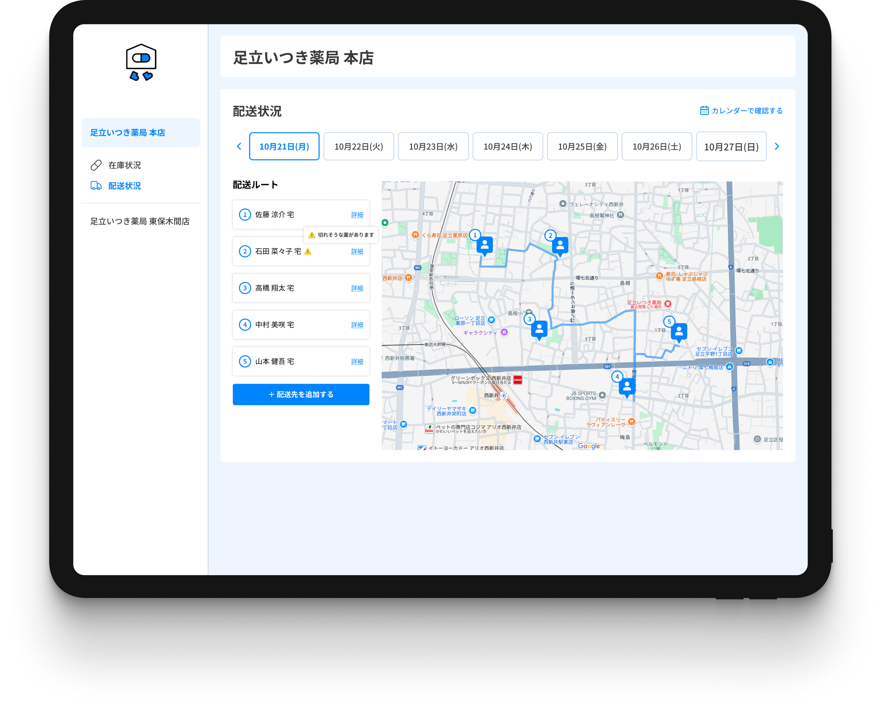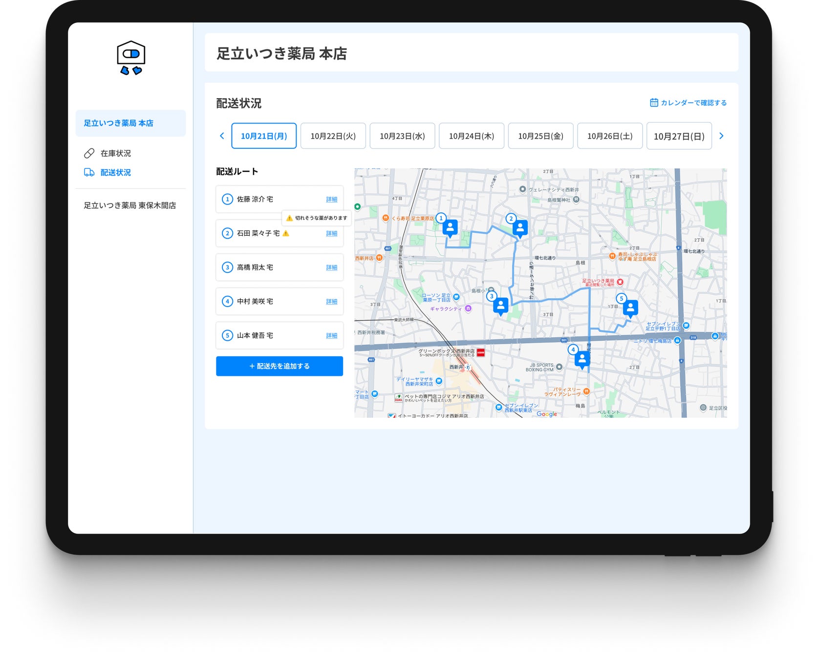 足立区の地域医療を支える足立いつき薬局では、在宅患者向けの「医薬品配送管理システム」を開発しています。本システムは、訪問診療や在宅医療で処方された薬の配送を自動スケジュール化し、医師・薬剤師・患者の連携をスムーズにします。配送ルートや服薬タイミングを最適化することで、医療チーム全体の負担軽減と患者満足度の向上を実現。足立区に根差した薬局として、より安心・確実な在宅支援を目指しています。