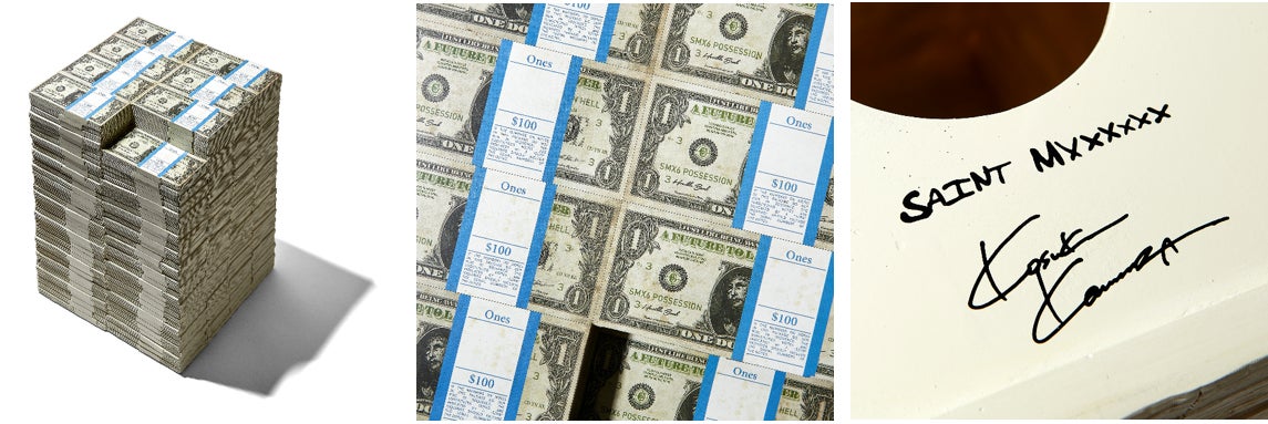 河村康輔の現代的な作風と、©SAINT Mxxxxxxの得意とするクラシックな雰囲気が掛け合わされたコラボレーションは、クルーネックスウェットとブランド初となるスツールを展開。シュレッダー・コラージュやその他様々な手法が河村康輔の感性で施された作品となります。1ドル札が積み上げられたユニークなデザインが目を引くスツールは、河村康輔の代表作ともいえるドル紙幣モチーフのグラフィックが落とし込まれ、株式会社ロータリー・ヒロとのコラボレーションにより実現。スツールの裏面には🄫SAINT Mxxxxxxと河村康輔のロゴが入ったスペシャルなアイテムとなっております。