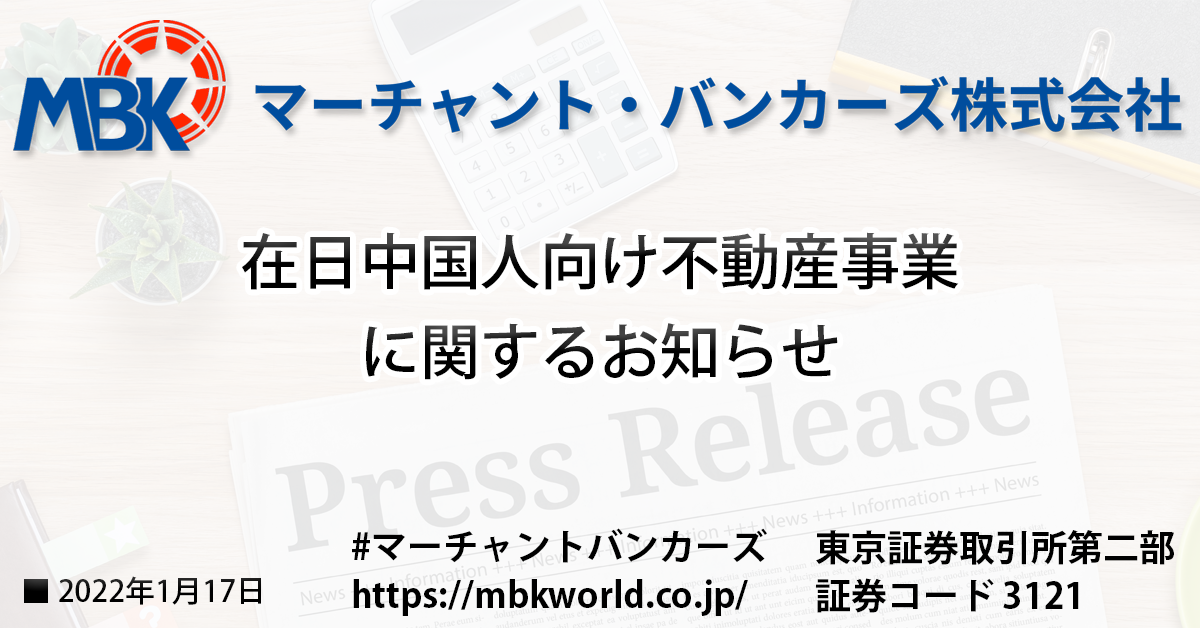 当社マーチャント・バンカーズ株式会社は、2022年1月17日、在日中国人のお客様に向けまして、不動産の販売並びに賃貸の仲介のサービスを開始いたしますので、お知らせいたします。