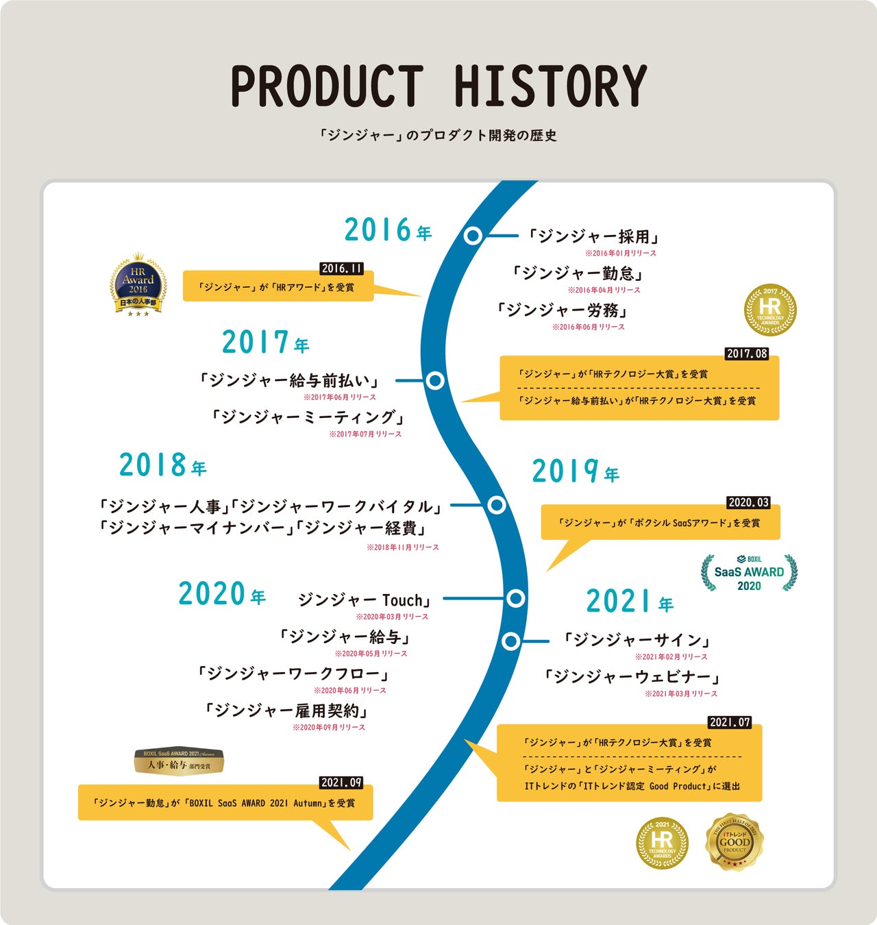 日頃の皆様からのご支援とご愛顧もあり、この6年間で、「ジンジャー」シリーズは、「勤怠管理」「労務管理」「給与前払い」「Web会議」「人事管理」「ワークバイタル」「経費精算」「給与計算」「ワークフロー」「雇用契約」「電子契約」「ウェビナー機能」など12のサービスをリリースし、多くのユーザーへ現在提供中です。また、この間、「ジンジャー」シリーズは、「HRアワード」や、「HRテクノロジーアワード」を受賞するなど高い評価もされています。2022年度中も複数のサービスリリースを検討しており、バックオフィス向けクラウドサービスとして、更なる機能向上を図って参ります。