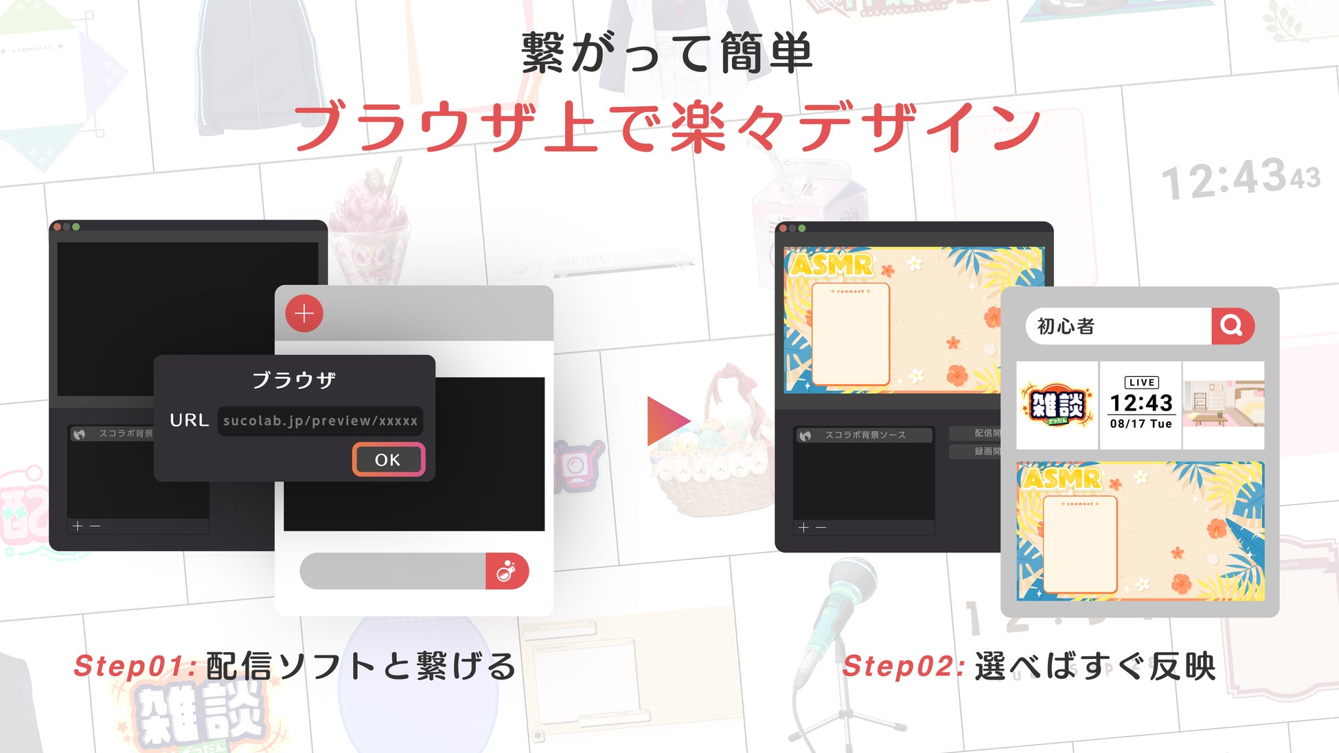 スコラボでは、普段お使いのライブ配信ソフトに指定のURLを挿入することで、オンライン上で4000点以上の完全無料素材を活用しながらの配信画面デザインを可能にするサービスです。また、提供される素材はサムネイルや普段のSNS活動でも利用できることができ、従来のライブ配信ソフトの枠組みを超えて配信活動を拡張します。