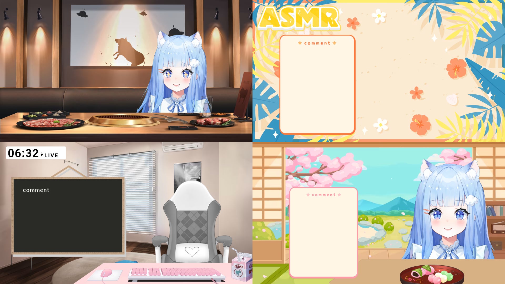 背景・コメント欄はもちろん、充実した小物・衣装・時計素材、イメージカラーにマッチした色差分等によって、様々な配信のテイスト・シチュエーションを実現することができます。