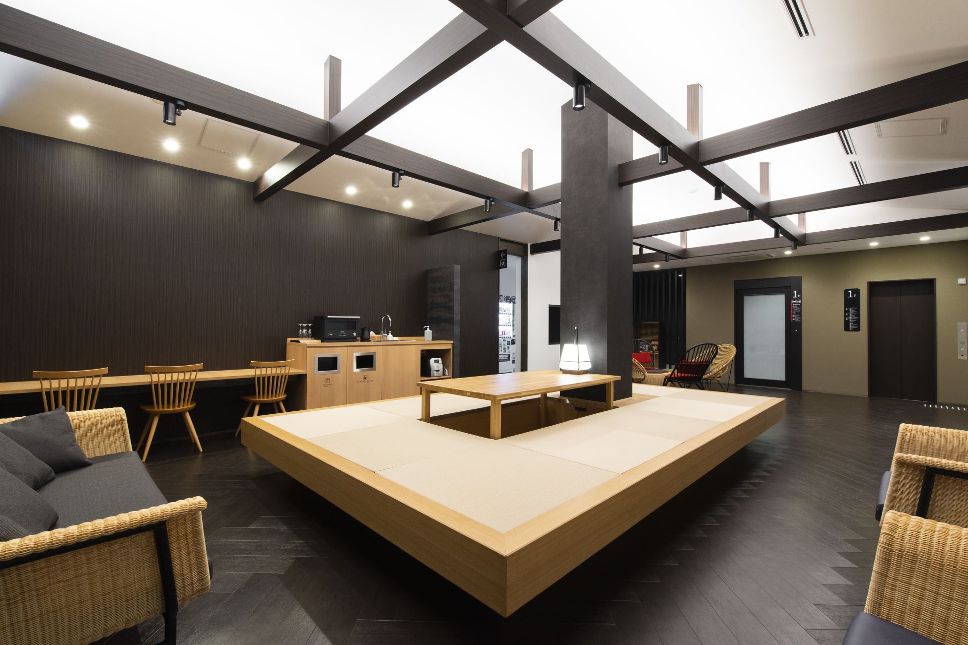明日の支度や次の旅の準備ができる要素を館内に散りばめたデザインコンセプトは「縁日」で京都らしい和のインテリアを活かした空間になっています。中庭に面した大浴場は、旅の疲れを癒す温泉効能の半露天風呂を完備。宿泊者専用ラウンジでは、「SMART縁日」と称した縁日コーナーを設け、駄菓子バーやビールサーバーなどを設置しリラックスできる湯上り処をイメージした空間が広がっています。宿泊者ラウンジに隣接されているライブラリースペースは、次の旅の準備ができるよう、ガイドブックや観光コンシェルジュサービスが導入されているタブレットなどを設置する予定です。
