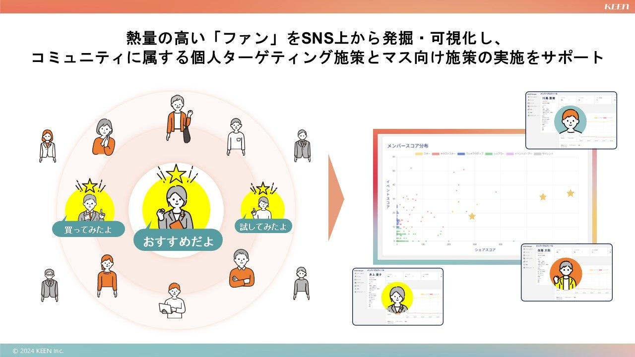 KEEN Manager(https://keen-inc.com/lp/keen-manager)は、顧客コミュニティに参加する方々のコミュニティ全体や参加者個人の活動傾向を可視化し、その中から「スター」となる熱量の高い人材(ファン)を発掘、育成するデータ分析ツールです。マーケティングイベント、コミュニティイベントへの参加データや、各種SNSやコミュニティポータルでの発信データを集約し、個人単位でデータを集約。個人をターゲティングした施策とマス向け施策をサポートします。