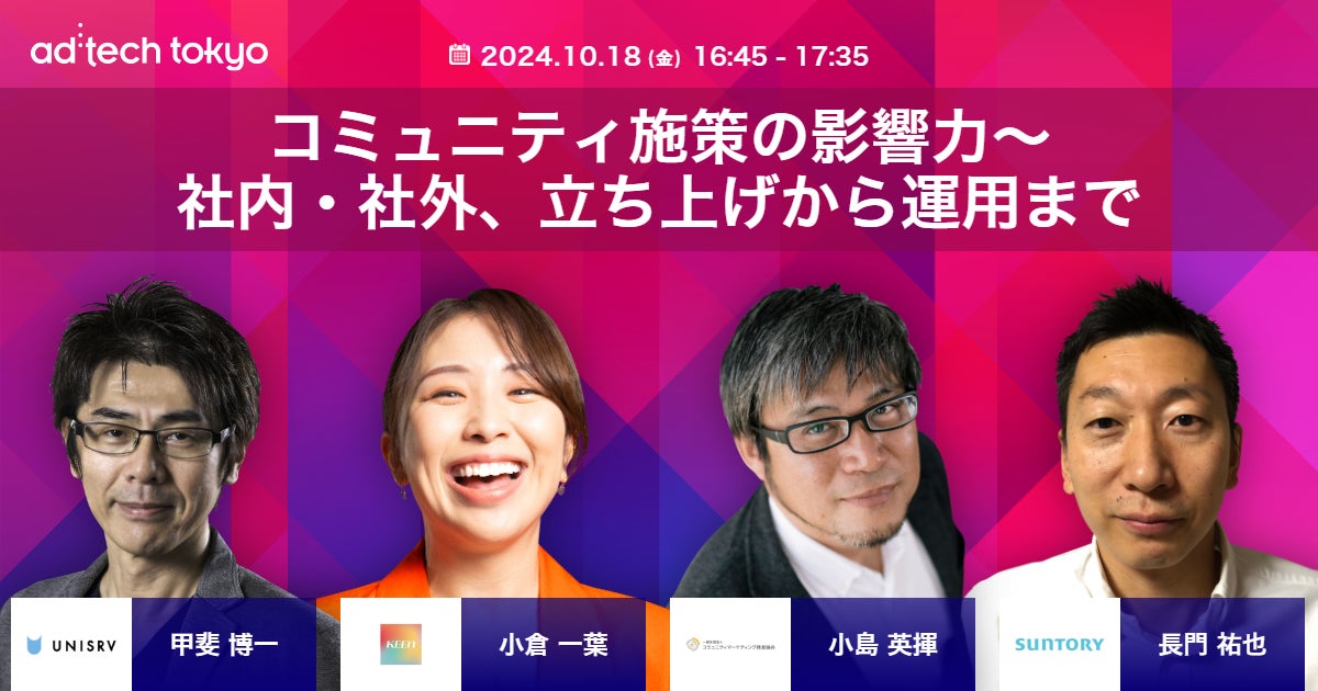 マーケティングの新たな地平線、コミュニティマーケティングの真髄に迫るad:tech 2024 最後のセッション!サントリーやAWSの成功事例をもとに、B2B/B2Cの垣根を越えた革新的手法を学びます。従来のインフルエンサーマーケティングとは一線を画す、この新しいアプローチの本質と実践方法を解き明かながら、コミュニティの着火点の見つけ方から、持続的な成長戦略、効果的なマネタイズまで、各フェーズの課題を第一線の実践者が徹底討論。さらに、経営陣を説得するROI設定の秘訣や、次世代技術がもたらす今後の可能性まで大胆に予測。人、テクノロジー、プラットフォームが織りなすコミュニティマーケティングは次世代型マーケティングの重要な柱となる未来図を描き出します。フロー型からストック型へ。あなたのマーケティング観を覆すadtech 2024 最後の50分をお見逃しなく!(公式サイトより転記)