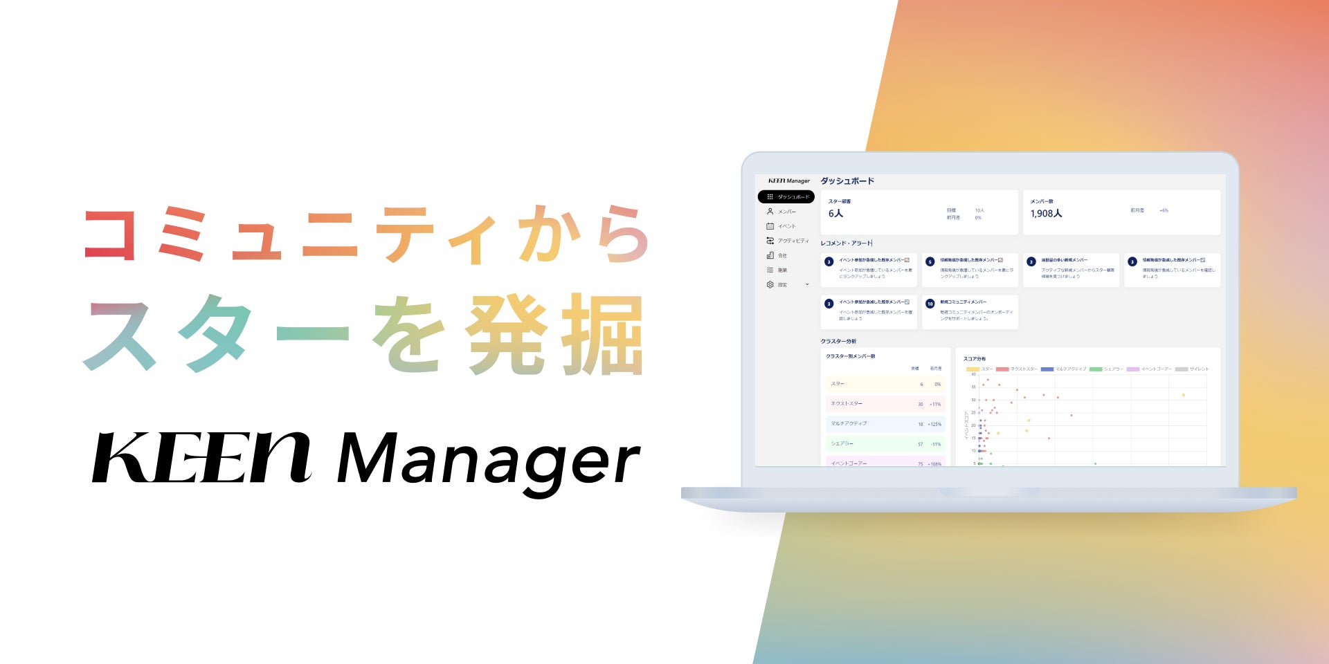 そこでの知見やノウハウ、コミュニティ運営を行う中で感じた課題をもとに、コミュニティ内のユーザーデータ分析ツール「KEEN Manager」を開発し、経営目標の達成に向けてコミュニティ活動に注力している企業様を中心に導入いただいております。