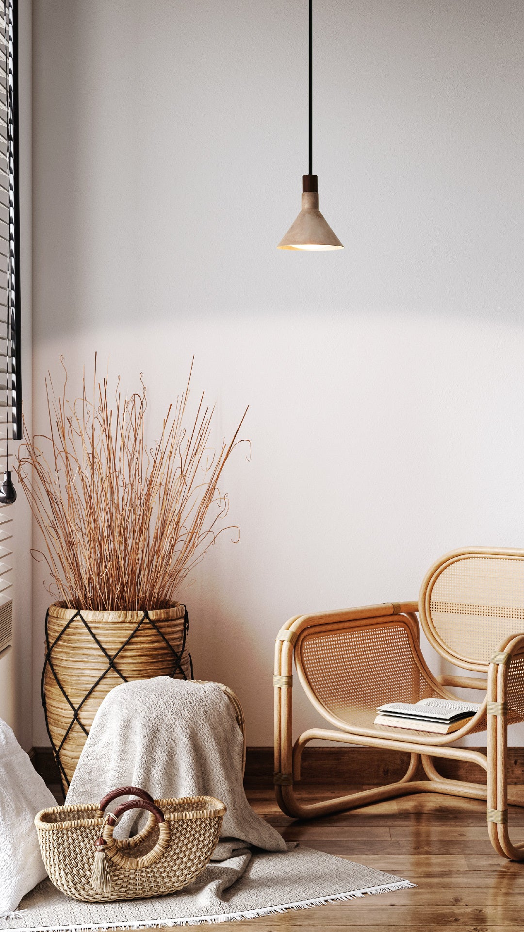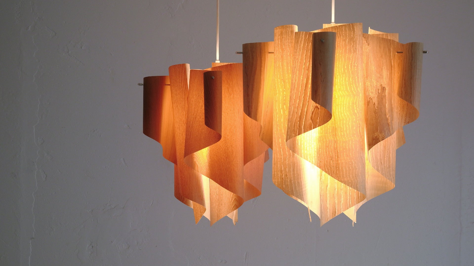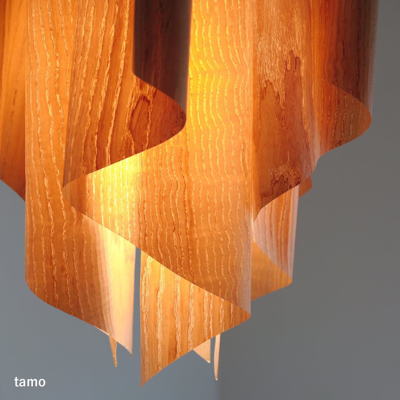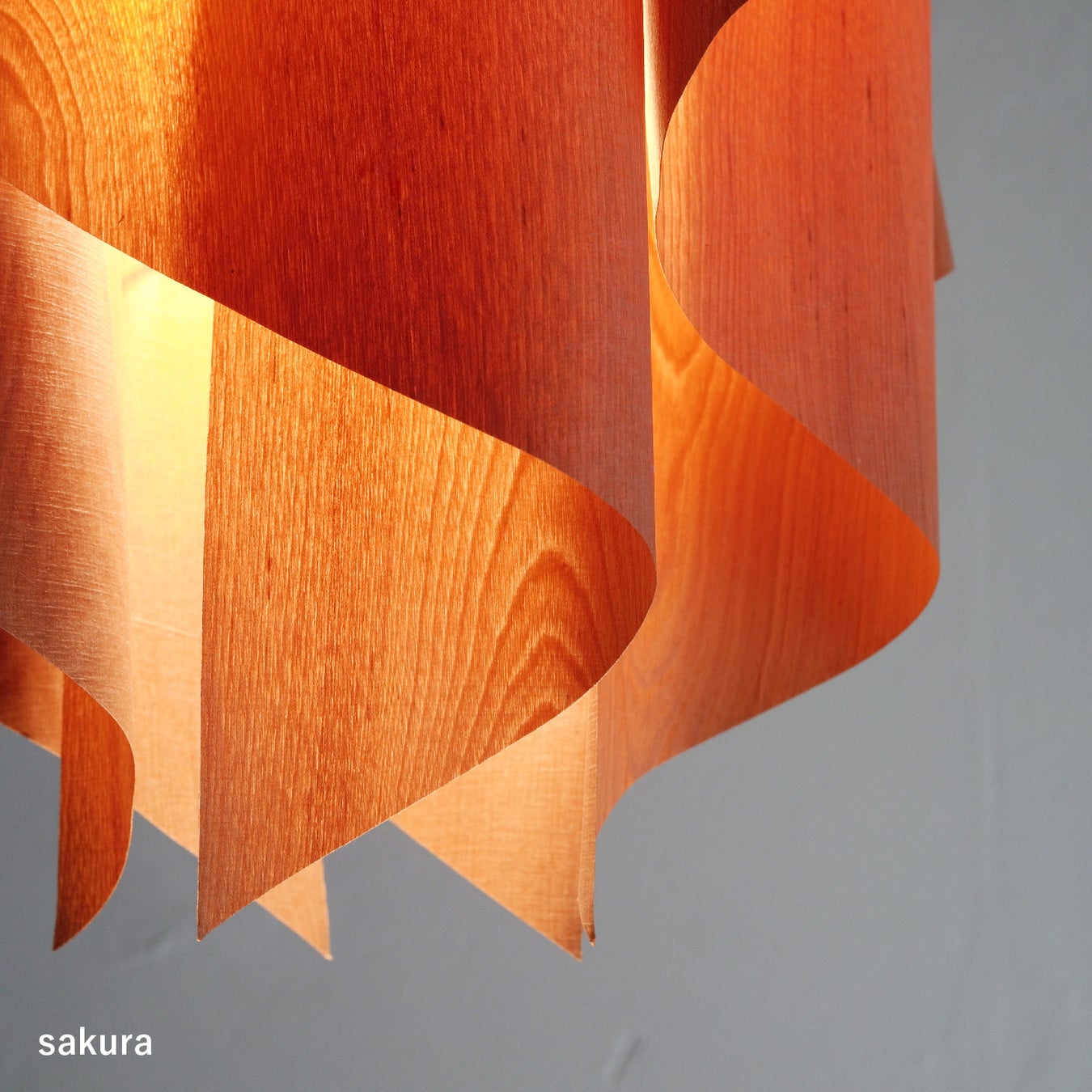 シェードには国産のサクラ材とタモ材を使用しました。美しい木目のシェードを透した光は、やわらかさとオレンジの色味を増し、空間にやすらぎを与えます。天然木を極薄にスライスし、特殊な下地加工をすることで、薄く軽やかなカーブを実現しています。