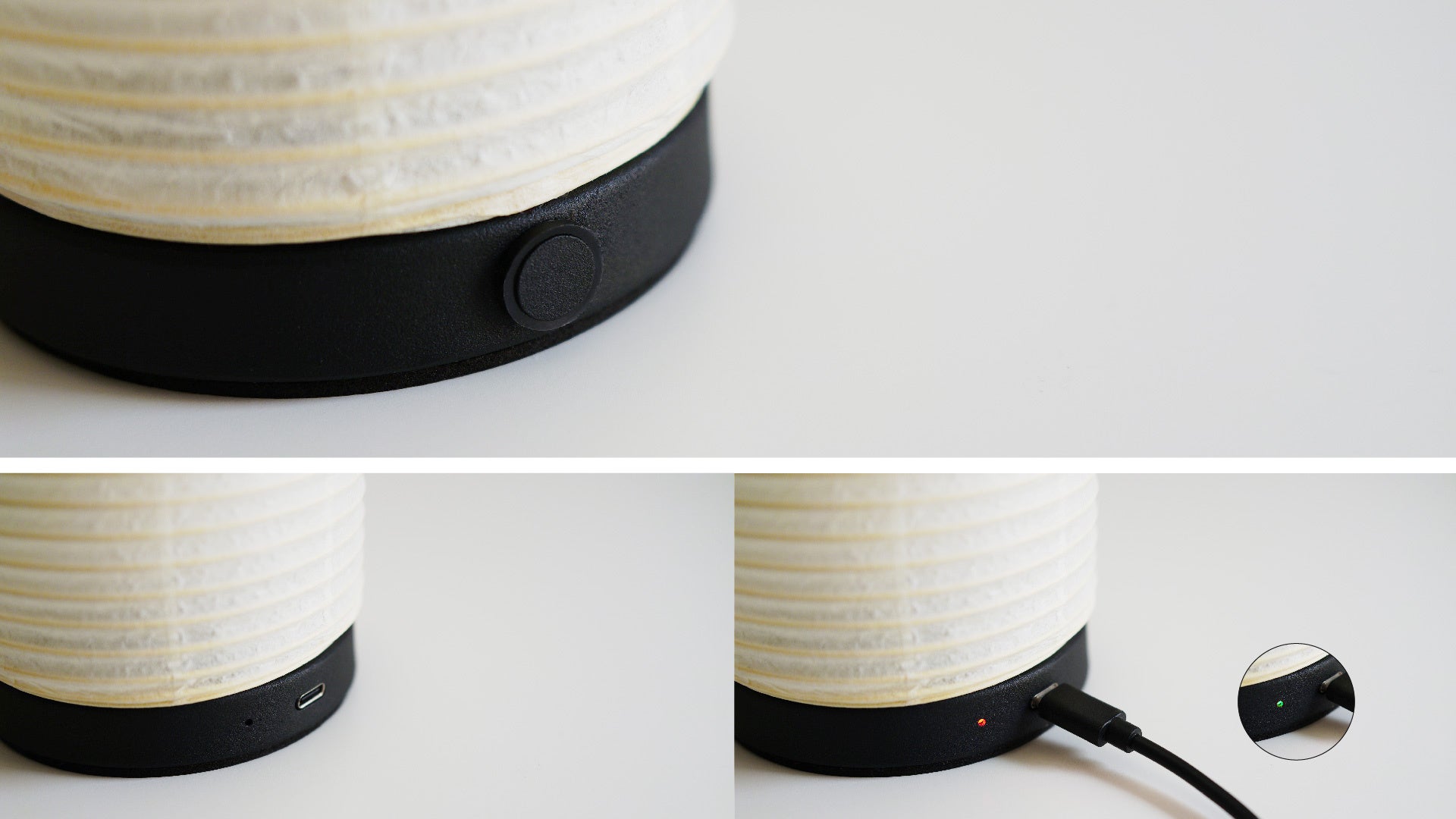 ベース部分の電源ボタンに長く触れると、灯りの表情が変わります。部屋に明るさを足す光から、食事を楽しむ光、ろうそくのようなほのかな光へと無段階でゆっくり暗くなっていきます。もう一度長く触れるとゆっくり明るくなります。消灯するタイミングで直前の明るさが記憶されるので、もう一度点灯した時に同じ明るさで点灯させることができます。ボタンはタッチセンサー式なので、軽く触れるだけで反応します。