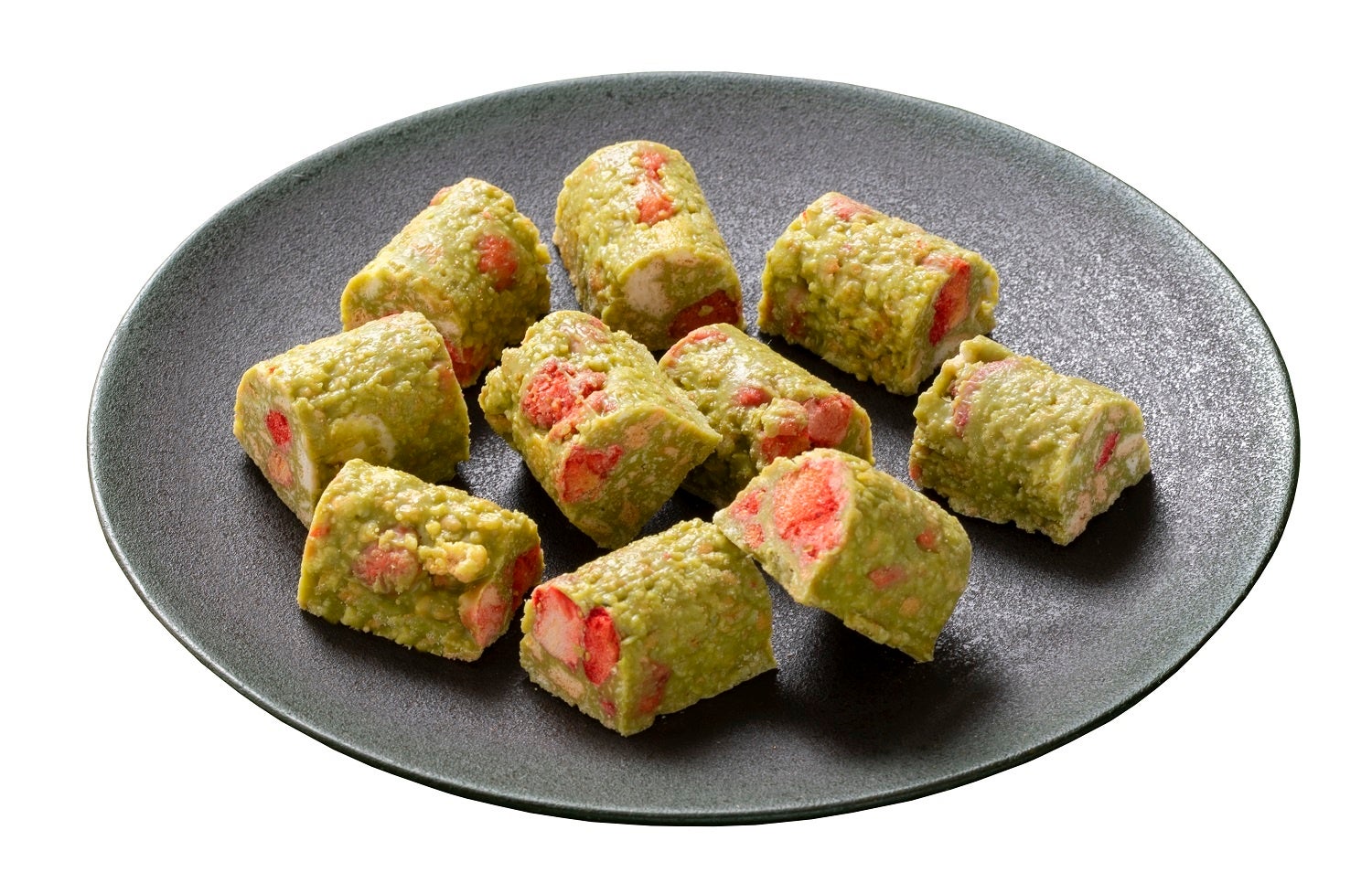 【内容】チョコの甘味と苺の酸味を一粒で楽しめるチョコレート。ホワイトチョコと京都府産宇治抹茶使用の抹茶チョコを、フリーズドライの苺に2層掛けしました。サステナブルカカオ使用。